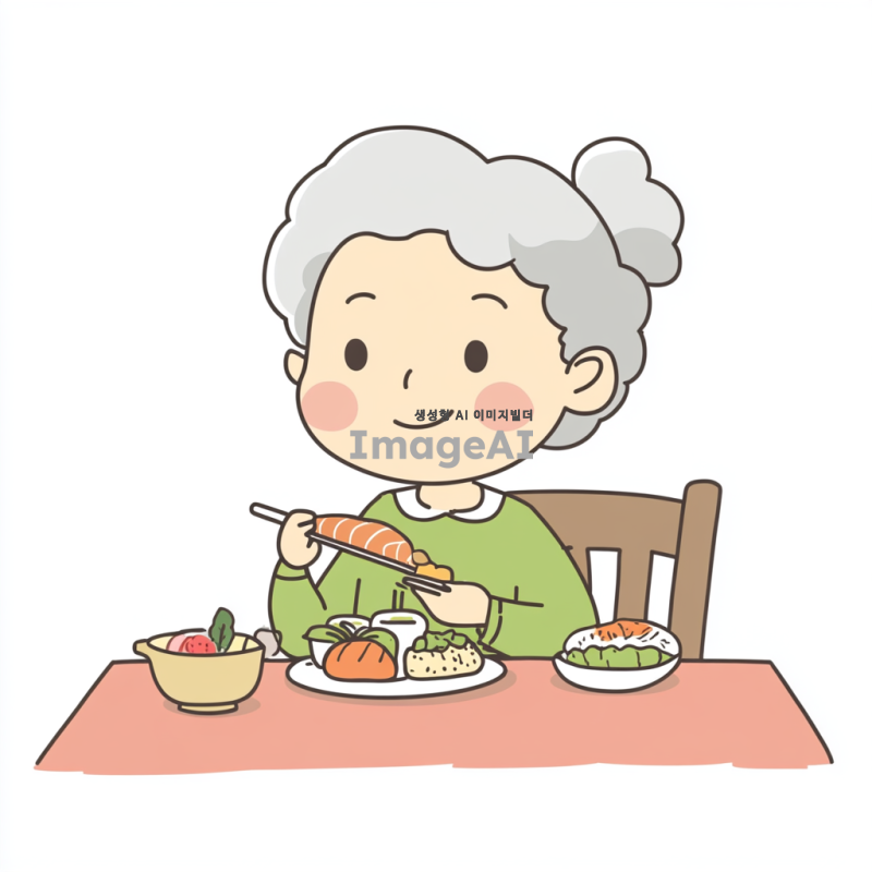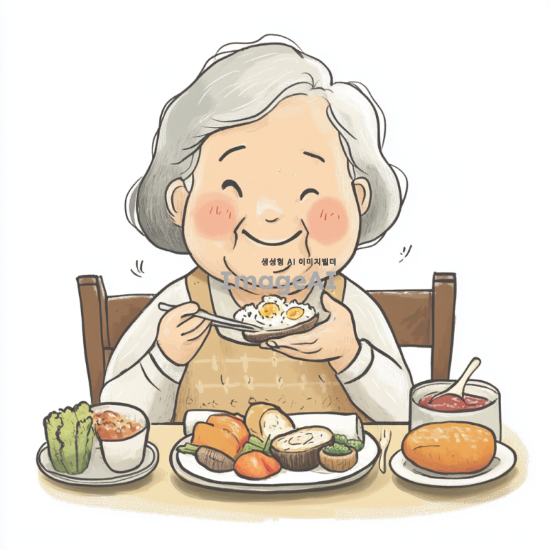 회색 단발머리 할머니가 식탁에 앉아 다양한 음식을 먹으며 행복한 표정을 짓고 있는 일러스트. 캐릭터는 입체적이지 않고, 라인 선으로만 표현되어 있으며, 전체적인 분위기는 따뜻하고 기분 좋은 느낌을 주도록 디자인. 배경은 단순하게 식탁과 의자만 나타나도록 구성.
