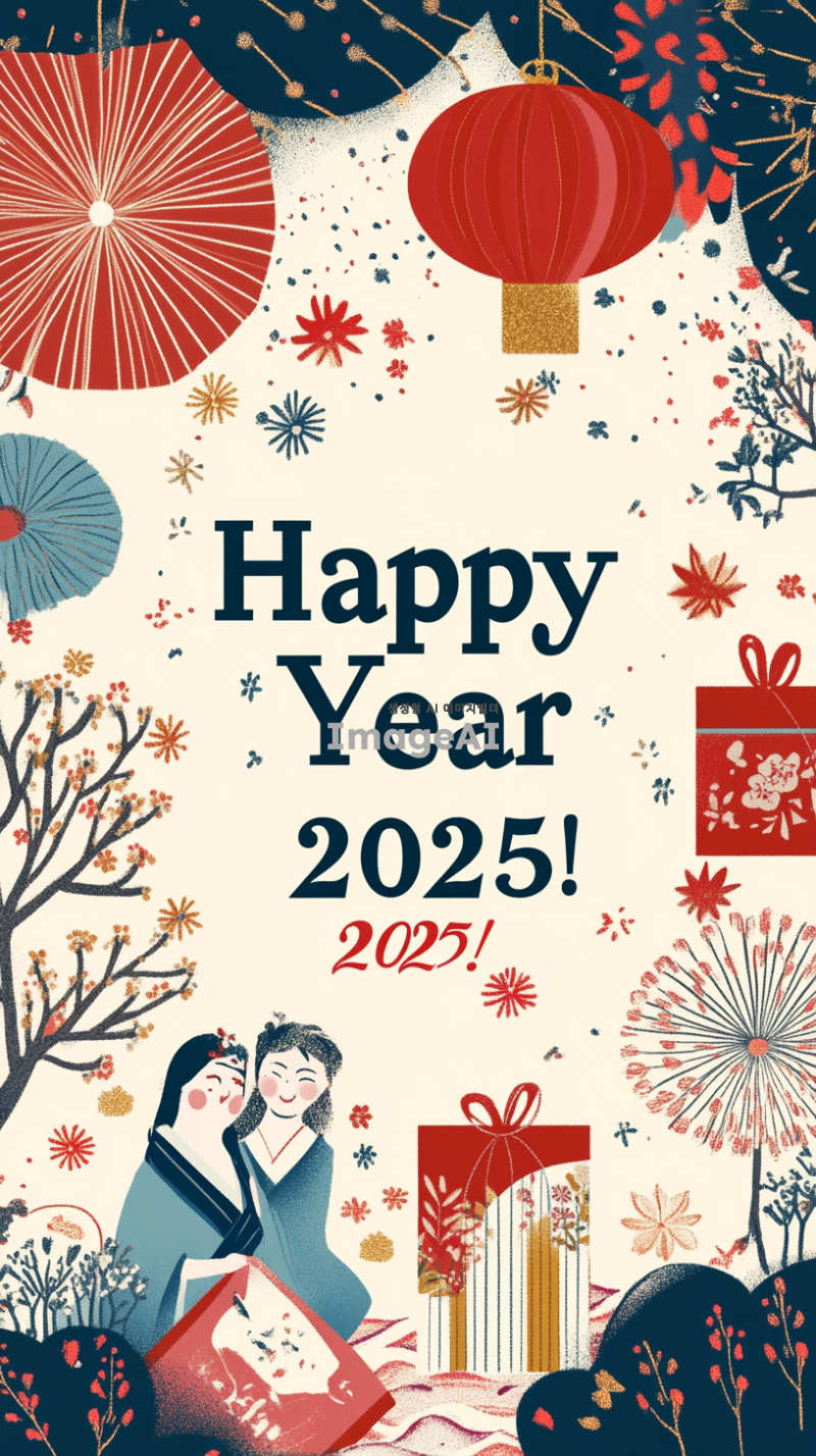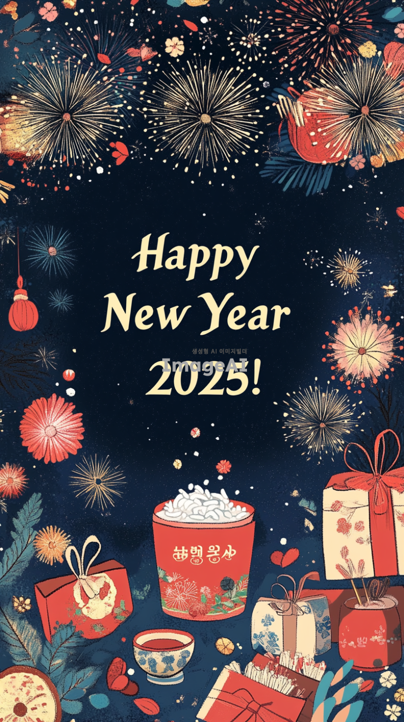 2025년 새해를 맞아 한국의 전통적인 요소와 현대적인 감각이 조화를 이루는 인사 카드 디자인. 배경은 화려한 색감의 불꽃놀이와 함께 새해를 축하하는 분위기로 가득 차 있으며, 카드 중앙에는 "2025년 새해 복 많이 받으세요!"라는 인사말이 아름다운 서체로 적혀있고, 주변에는 복주머니, 떡국, 소원 나무 등의 한국 전통 아이콘이 배치되어 있는 이미지.