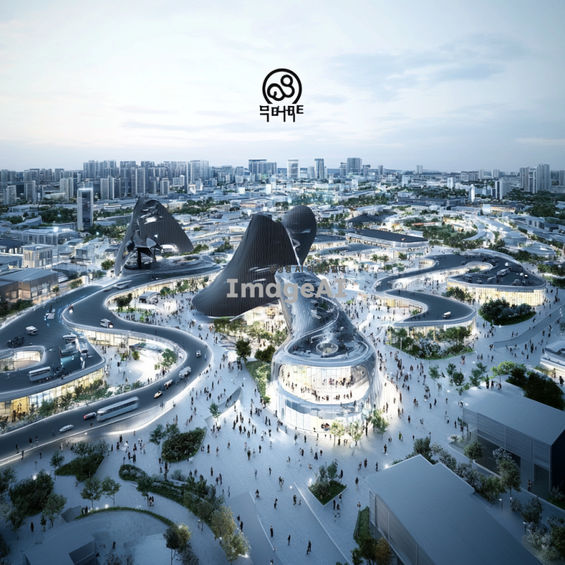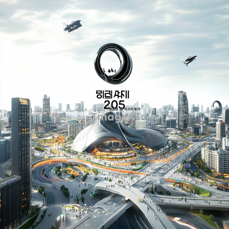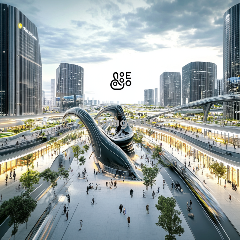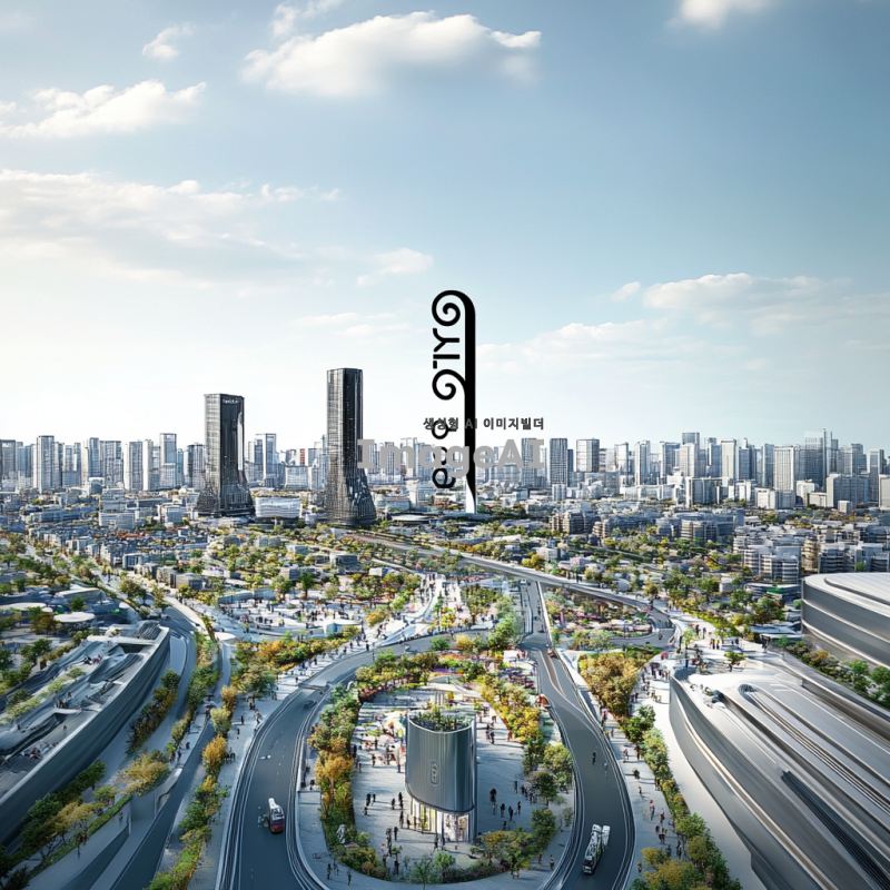 2025년의 한국 도시 풍경, 현대적이고 미래지향적인 건축물들이 어우러진 모습, 푸른 하늘과 구름이 있는 날씨, 거리에는 다양한 인종과 문화의 사람들이 함께 어울려 있는 장면, 스마트 기술이 접목된 교통수단과 공공시설, 자연과 조화롭게 어우러진 도시의 모습, 밝고 생동감 넘치는 색감.