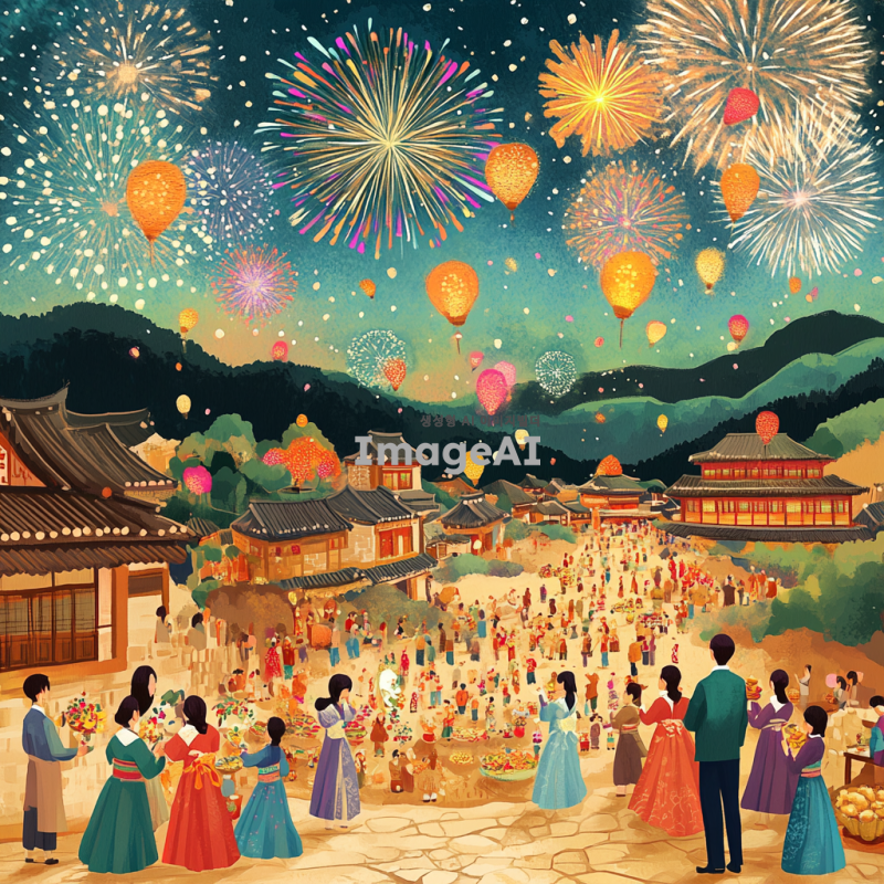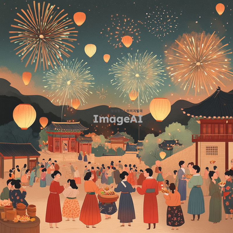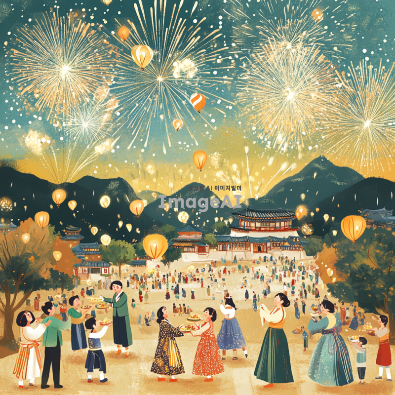2025년 새해를 맞이하는 한국의 전통적인 풍경을 배경으로 한 일러스트. 화려한 불꽃놀이가 하늘을 수놓고, 사람들은 새해를 축하하며 다채로운 한복을 입고 모여 있는 모습. 정겨운 가족들이 함께 떡국을 나누며 웃고 있는 장면과 함께, 새해 소망을 적은 연등이 하늘로 날아가는 모습도 포함. 따뜻하고 희망찬 분위기를 강조하며, 한국의 전통 문화와 현대적인 요소가 조화를 이루는 독특한 스타일로 표현.