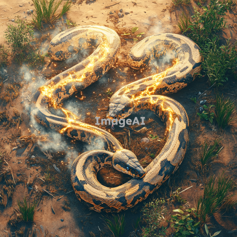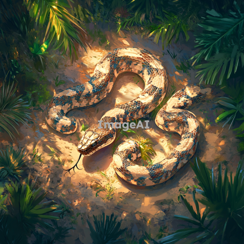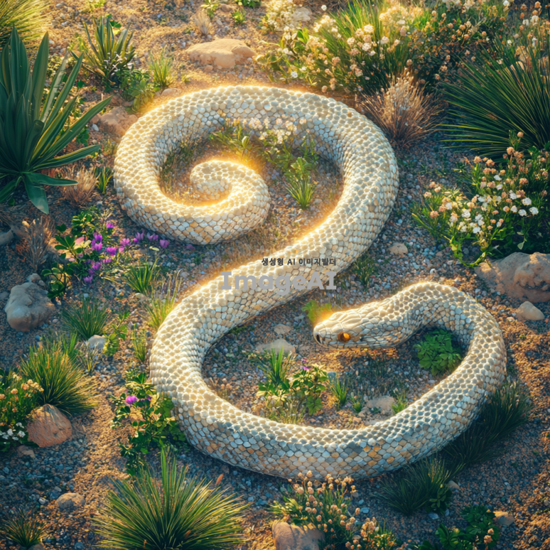 뱀 한 마리가 땅 위를 기어가며 2025라는 숫자를 형성하는 모습, 뱀의 비늘이 햇빛에 반짝이고, 주변에는 자연 풍경이 펼쳐져 있는 장면, 부드러운 색감과 생동감 넘치는 디테일로 표현된 그림.