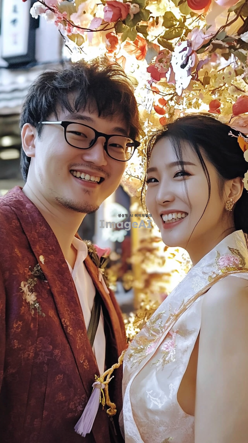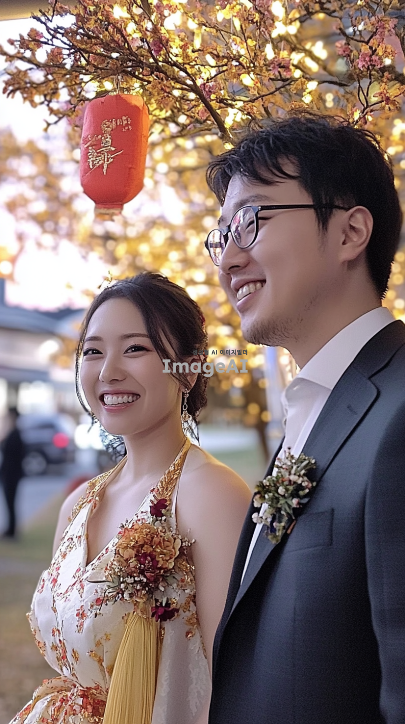 한국인 신랑과 신부가 서로를 바라보며 미소 짓고 있는 모습, 주변에는 가족과 친구들이 축하하는 분위기, 아름다운 꽃 장식과 전통적인 결혼식 소품들, 따뜻한 햇살 아래에서 행복한 순간을 나누는 장면.