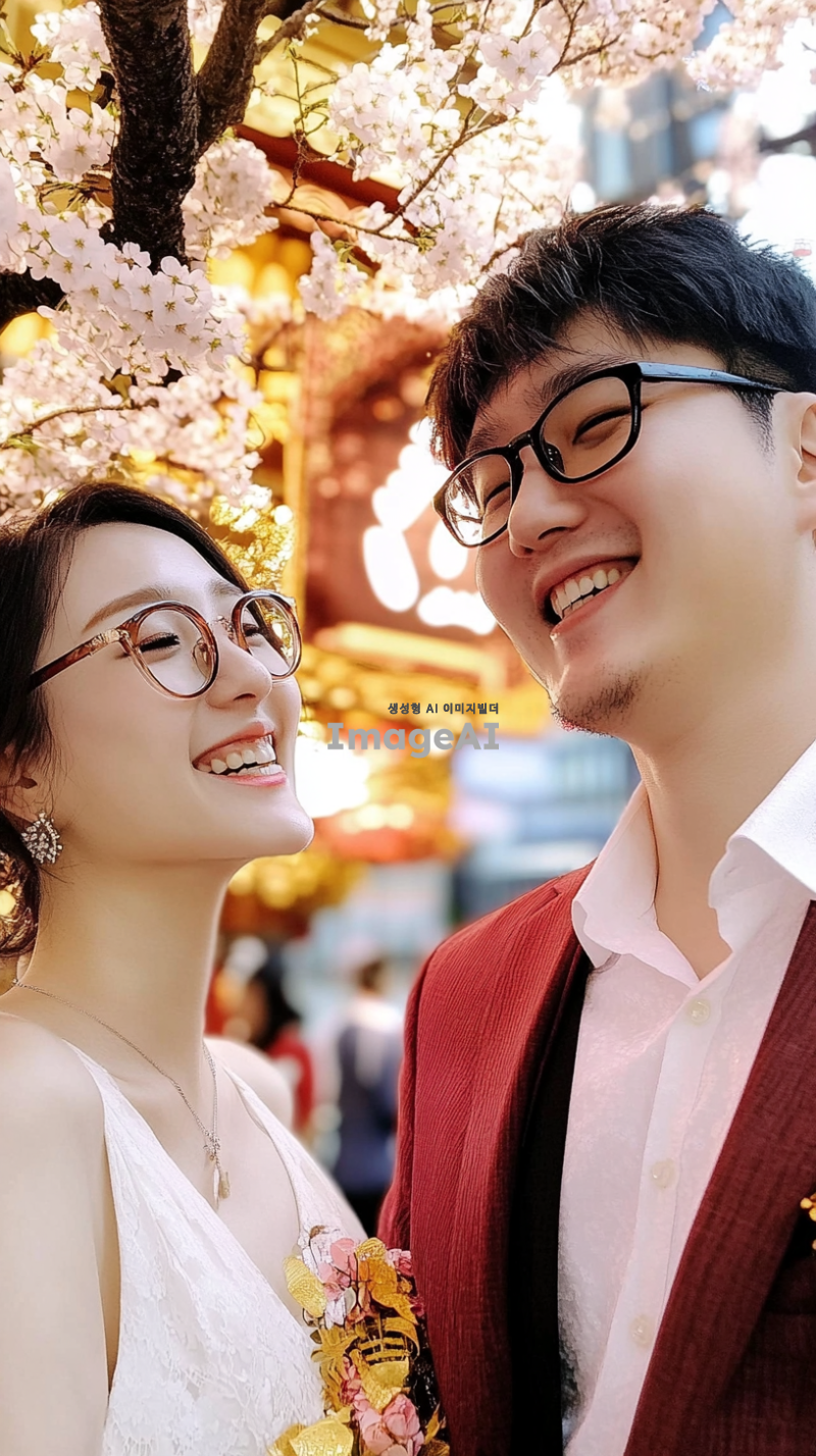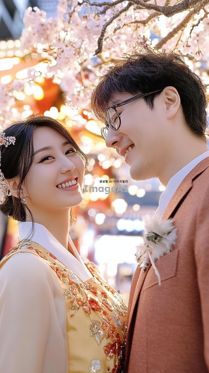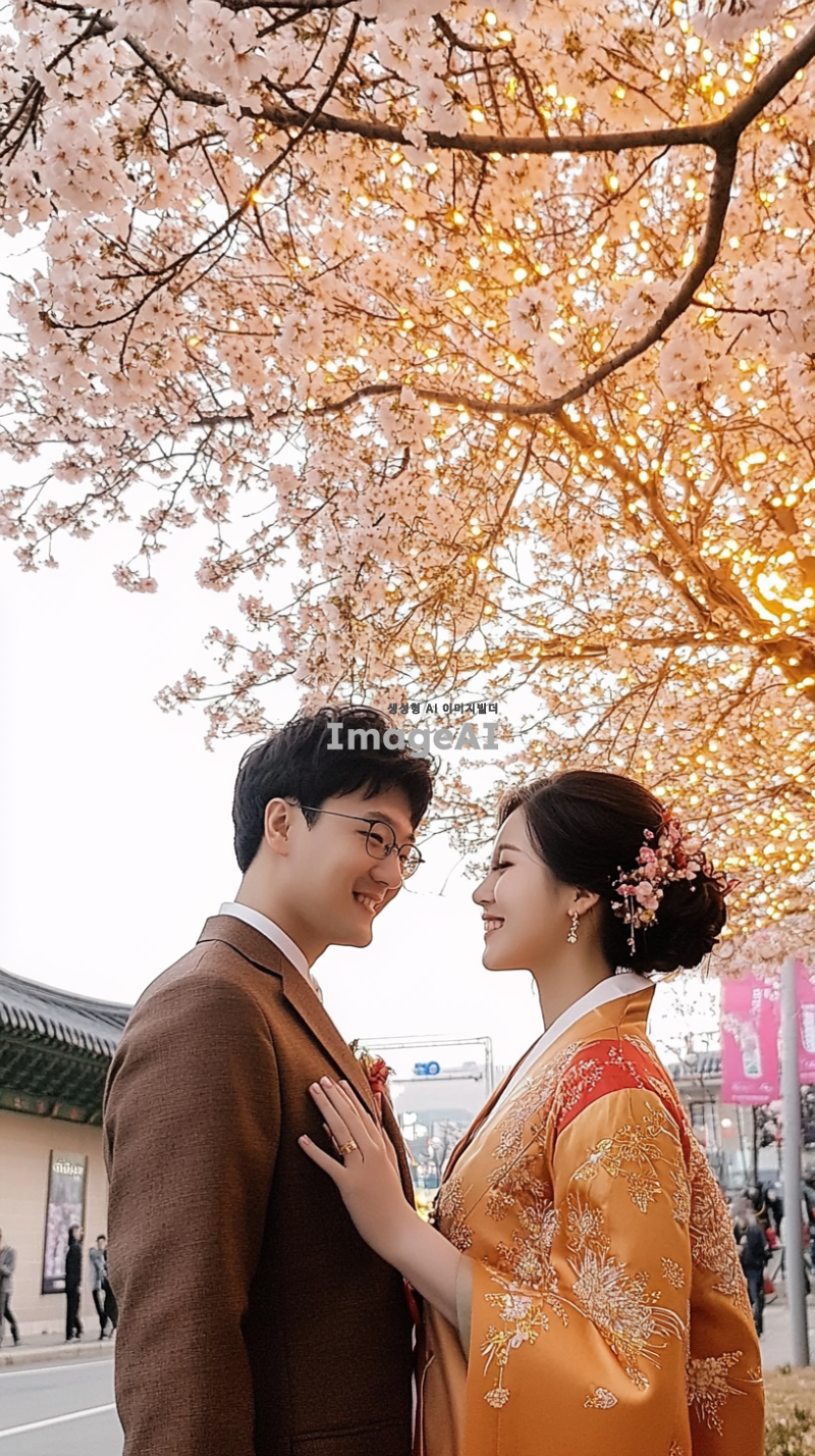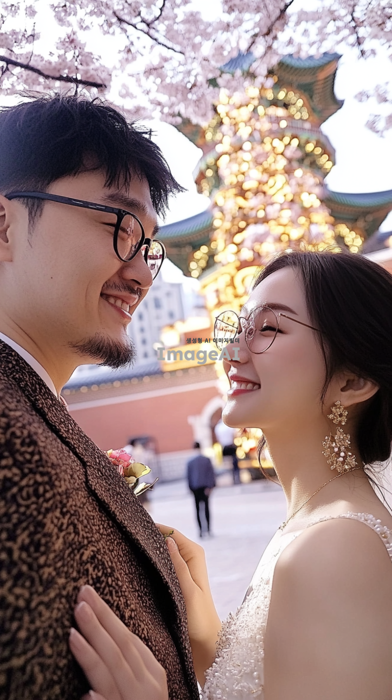 결혼식의 아름다운 순간을 담은 이미지, 한국 전통 혼례복을 입은 신랑과 신부가 화창한 날씨 속에서 서로를 바라보며 웃고 있는 모습, 배경에는 벚꽃이 만개한 나무와 고전적인 한국 건축물이 어우러져 있는 풍경, 따뜻한 햇살이 비추는 분위기, 사랑과 행복이 넘치는 장면.