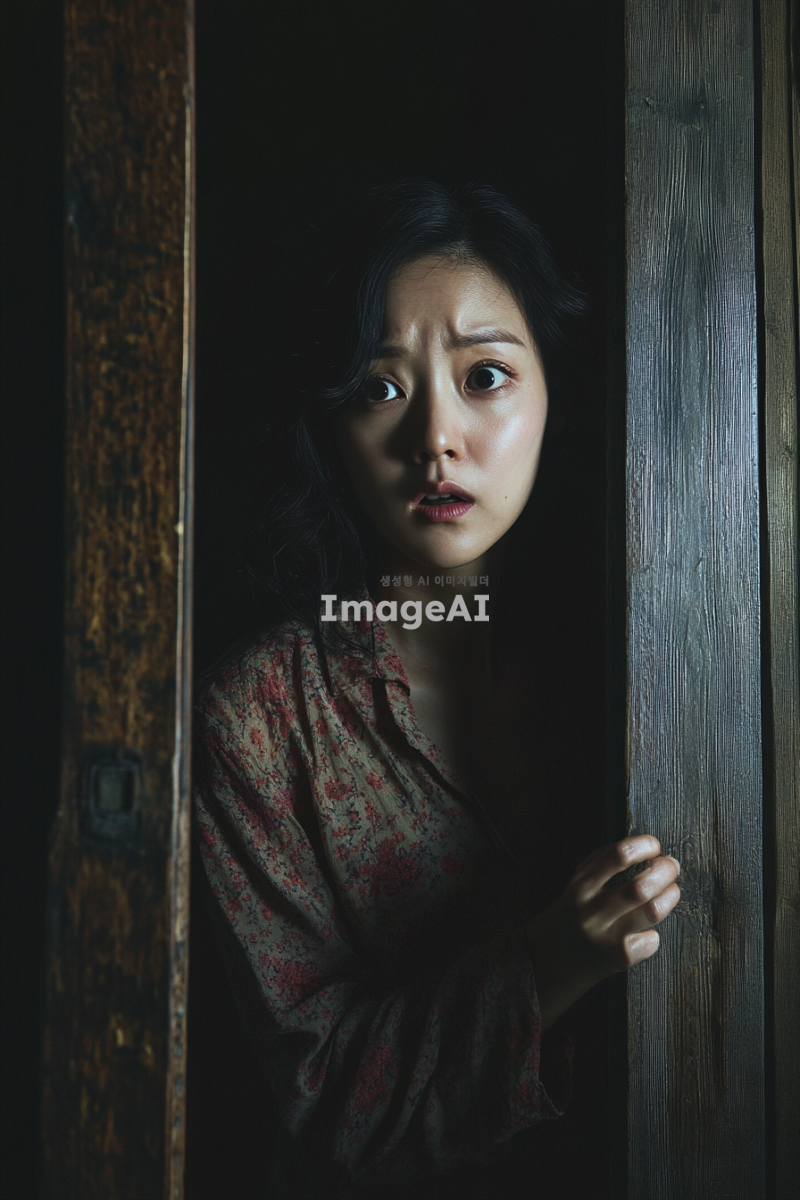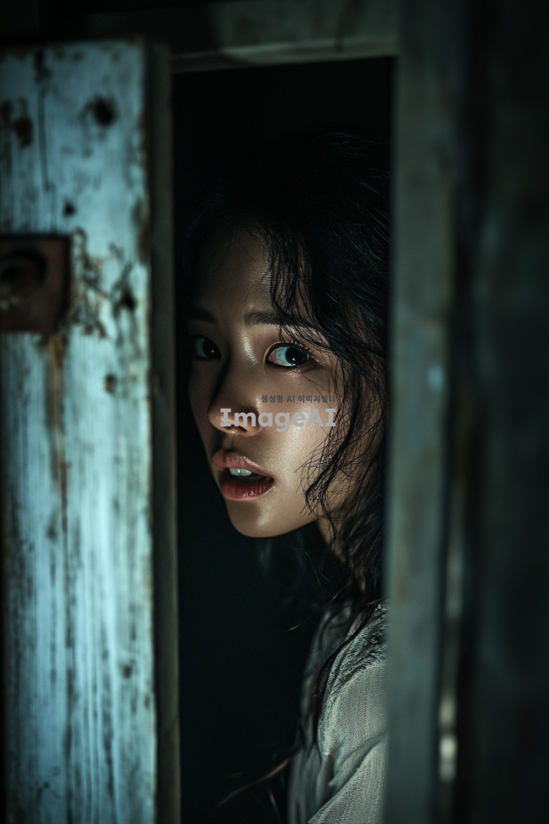 한국인 여성, 어딘가에 감금되어 있는 모습, 탈출하기 위해 문을 마구 두드리는 장면, 다급하고 간절한 표정, 예쁜 복장, 긴장감 넘치는 분위기, 어두운 방 안에서의 절박한 상황