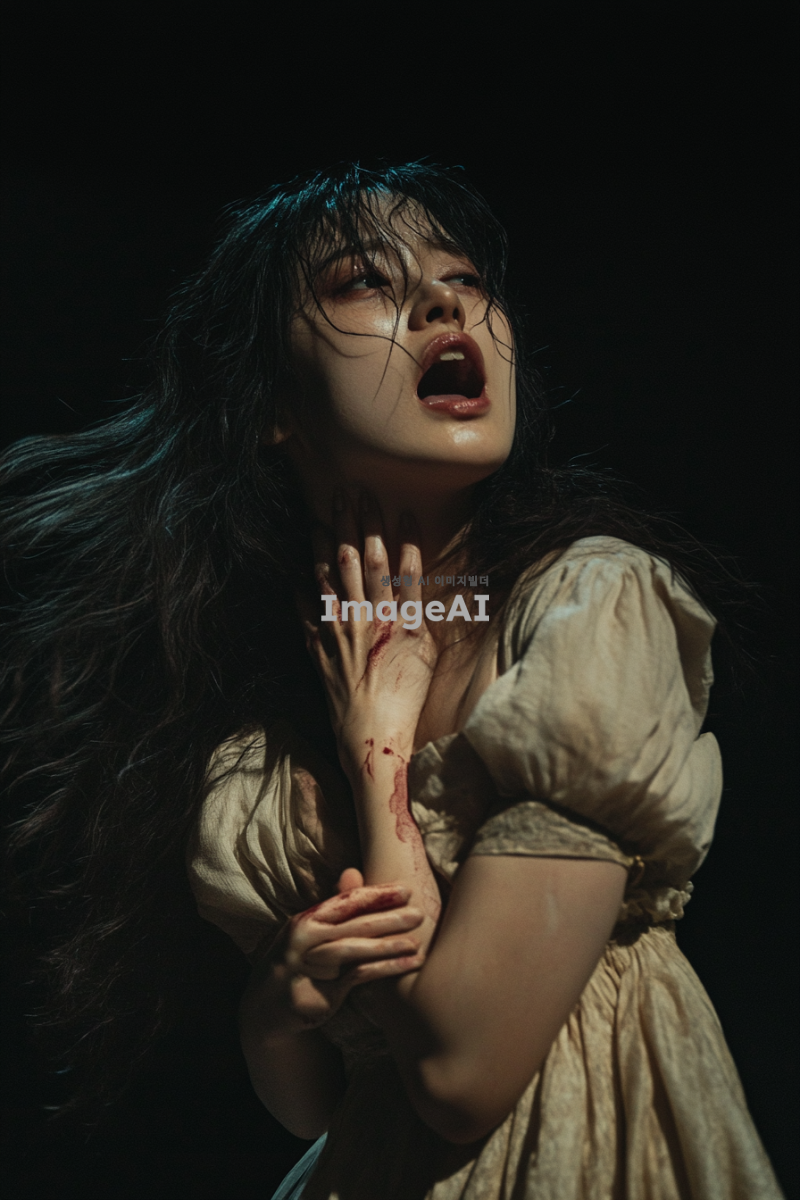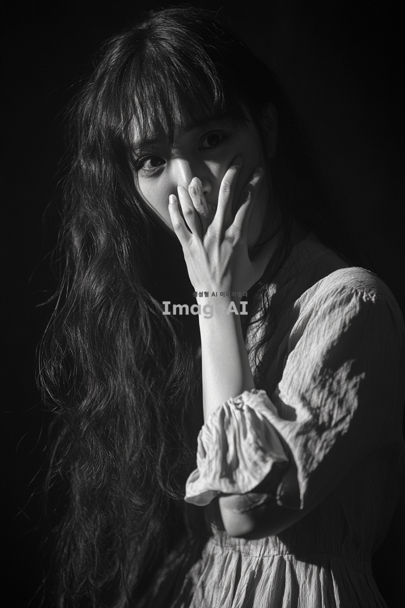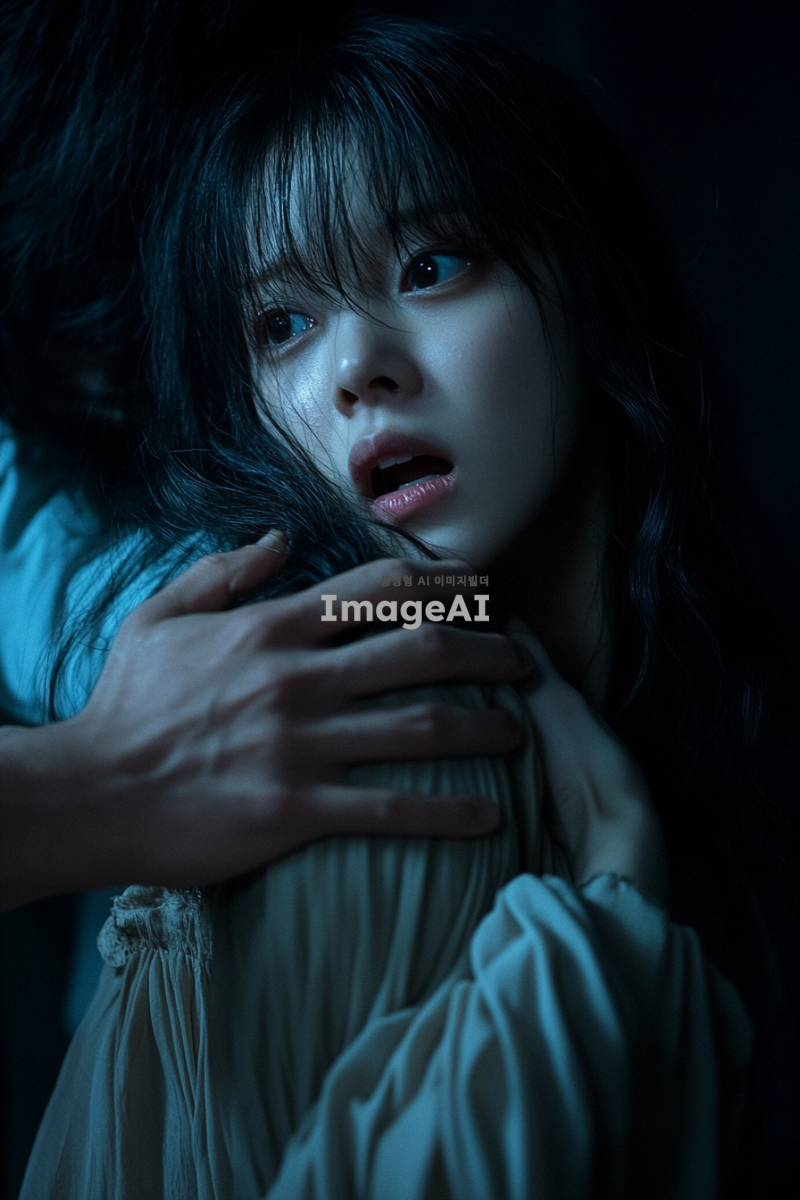 한국인 여성, 괴한에게 등 뒤에서 습격당하는 장면, 괴한의 손에 의해 입이 막히고 있는 모습, 괴한의 손아귀에서 벗어나기 위해 애쓰고 있는 긴장한 표정, 앞머리가 있는 긴 웨이브 머리 스타일, 긴 옷을 입고 있는 모습, 긴장감 넘치는 분위기, 어두운 배경, 극적인 조명 효과