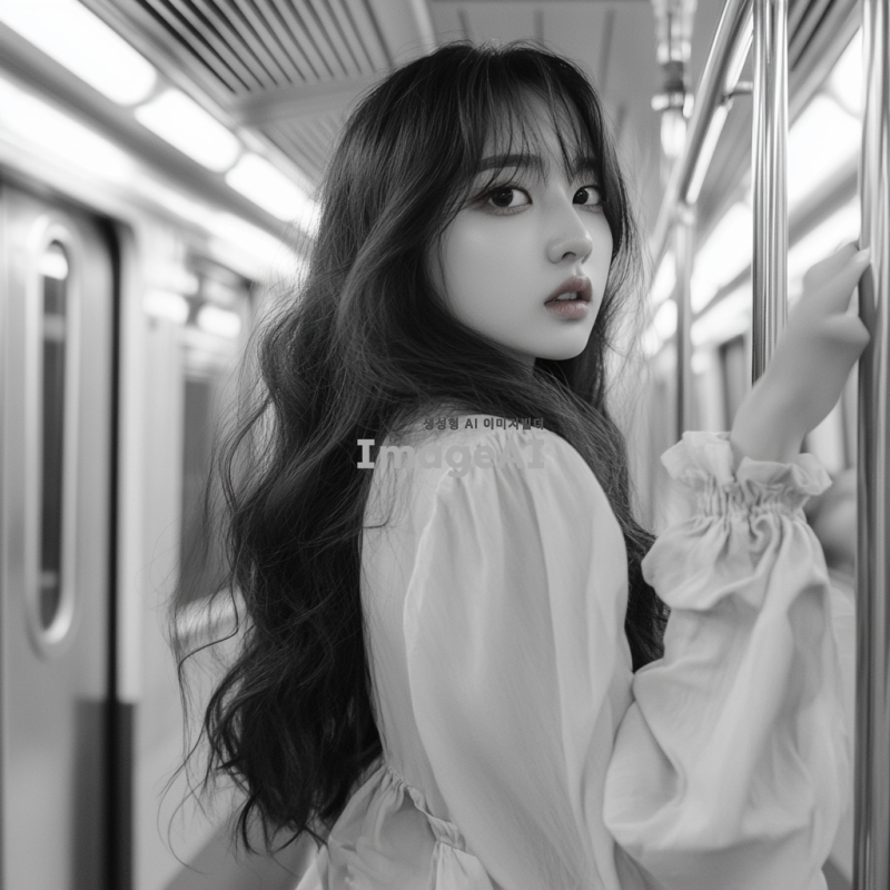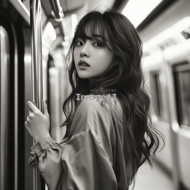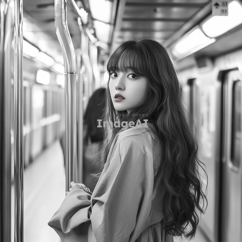 한국인 여성, 지하철 안에 서 있음, 지하철 손잡이를 잡고 있음, 고개를 돌려 뒤를 바라보고 있는 모습, 첫눈에 반한 듯한 표정, 앞머리가 있는 긴 웨이브 머리, 긴 옷을 입고 있는 모습