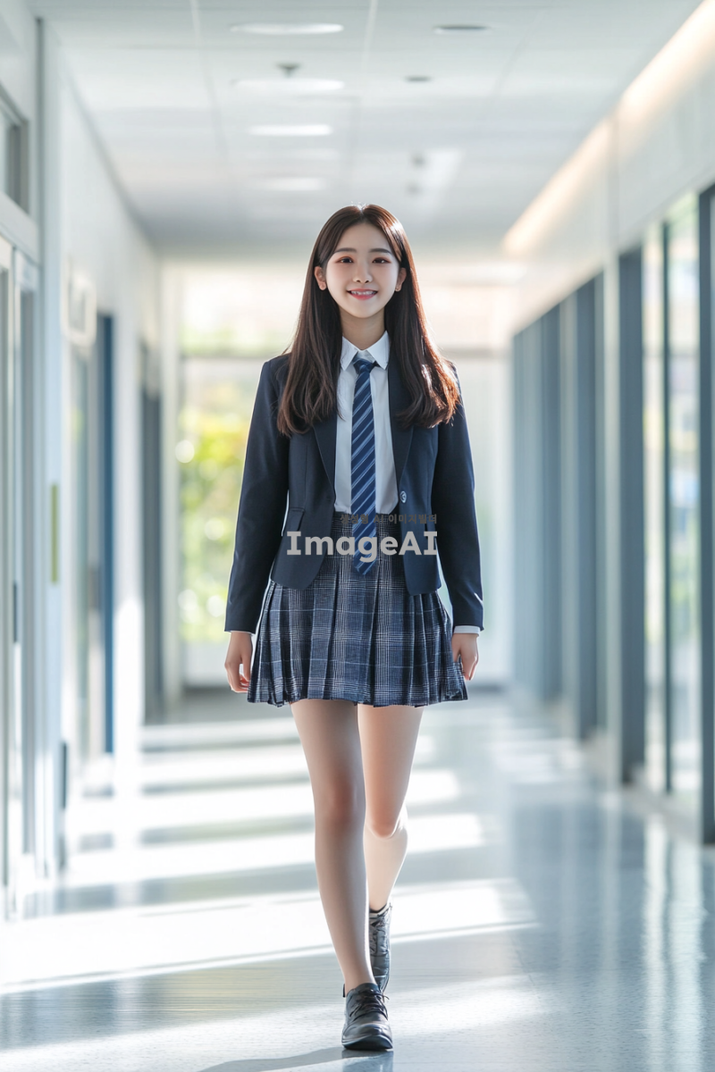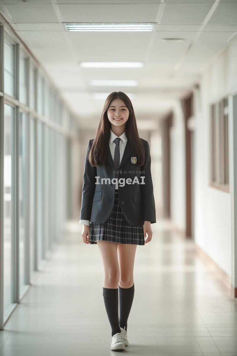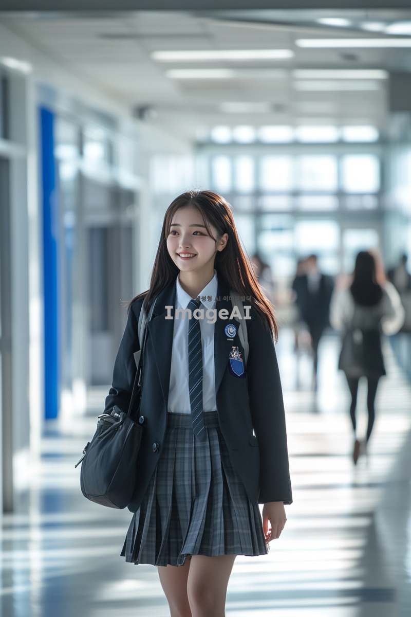 한국인 여학생이 교복을 입고 교복 넥타이를 매고, 교복 스커트를 입고 학교 복도를 걷고 있는 모습. 그녀는 밝은 미소를 지으며 자신감 있게 걸어가고 있다. 주변은 깨끗하고 현대적인 학교 환경으로, 자연광이 들어오는 복도의 모습이 담겨 있다.