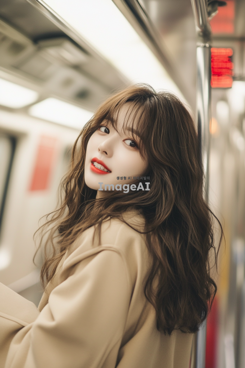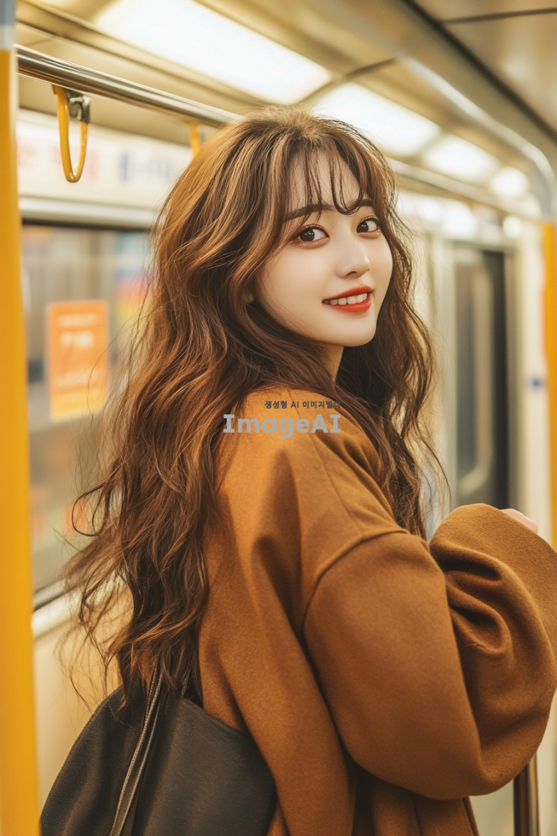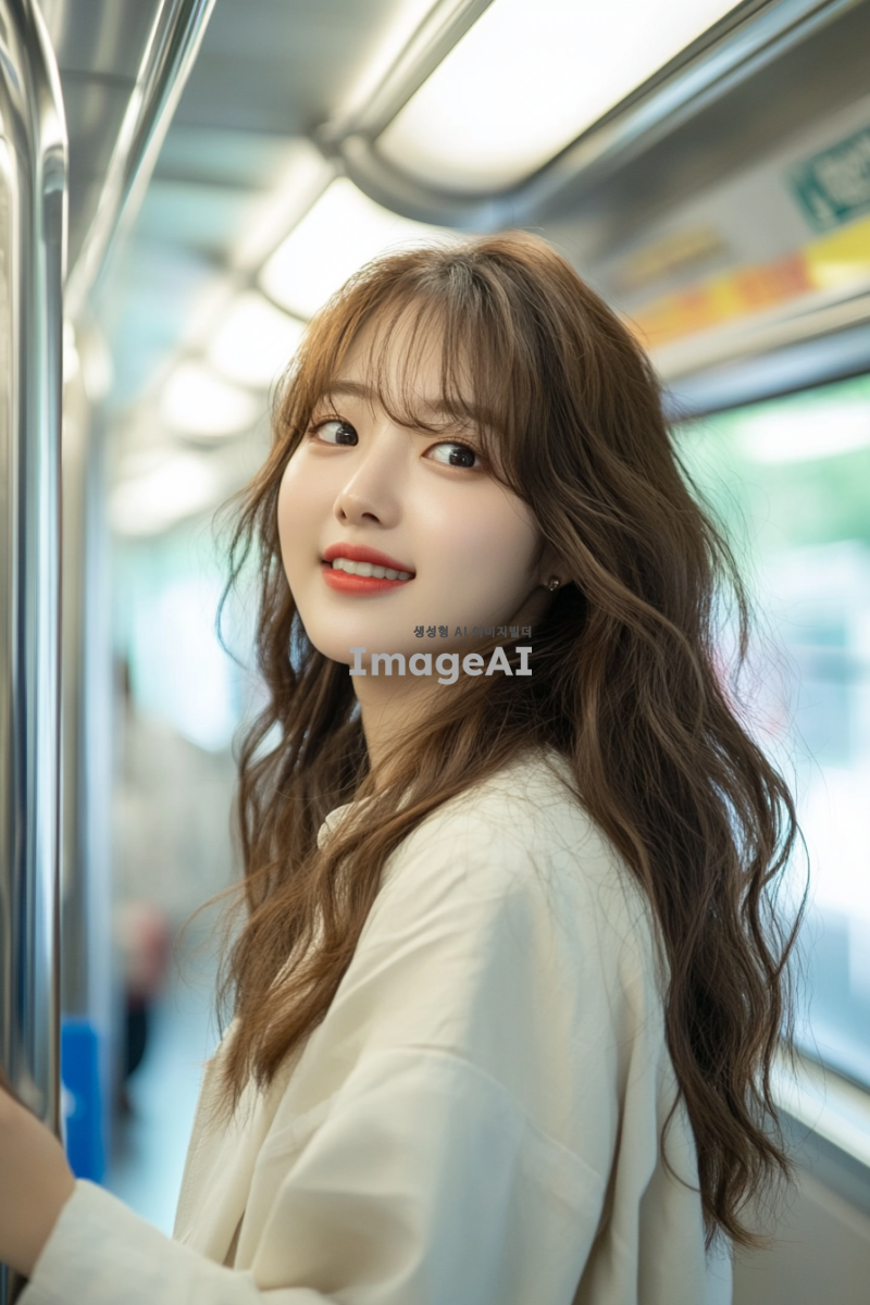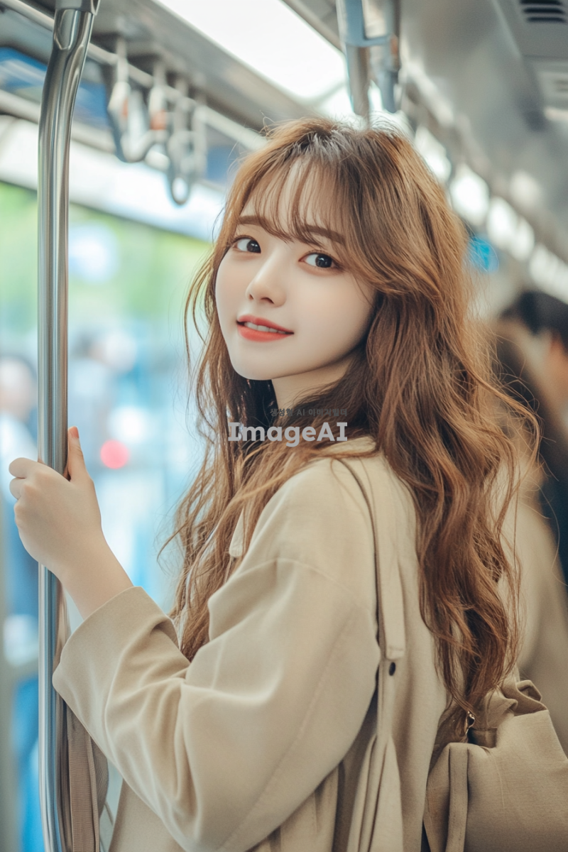 한국인 여성, 지하철 안에서 서 있음, 지하철 손잡이를 잡고 있음, 고개를 돌려 뒤를 바라보고 있음, 첫눈에 반한 듯한 표정, 앞머리가 있는 긴 웨이브 머리, 밝은 배경, 미소를 띄고 있음