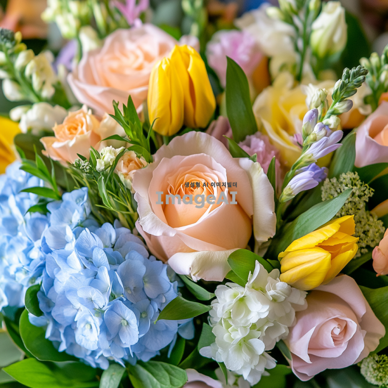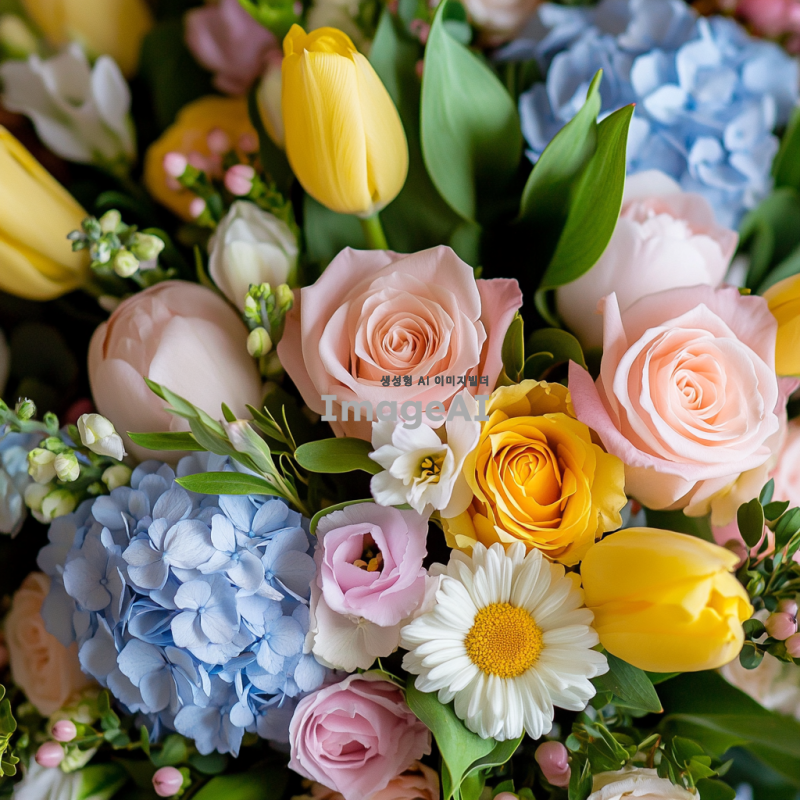 다양한 색상의 화려한 꽃들이 가득 담긴 아름다운 꽃다발, 연한 핑크색 장미, 노란색 튤립, 파란색 수국, 흰색 국화, 그리고 초록색 잎사귀들이 조화롭게 어우러진 모습, 부드러운 자연광 속에서 촬영된 느낌, 우아하고 생동감 있는 배경.