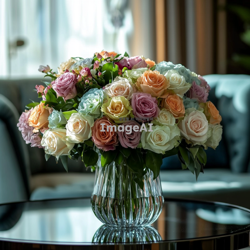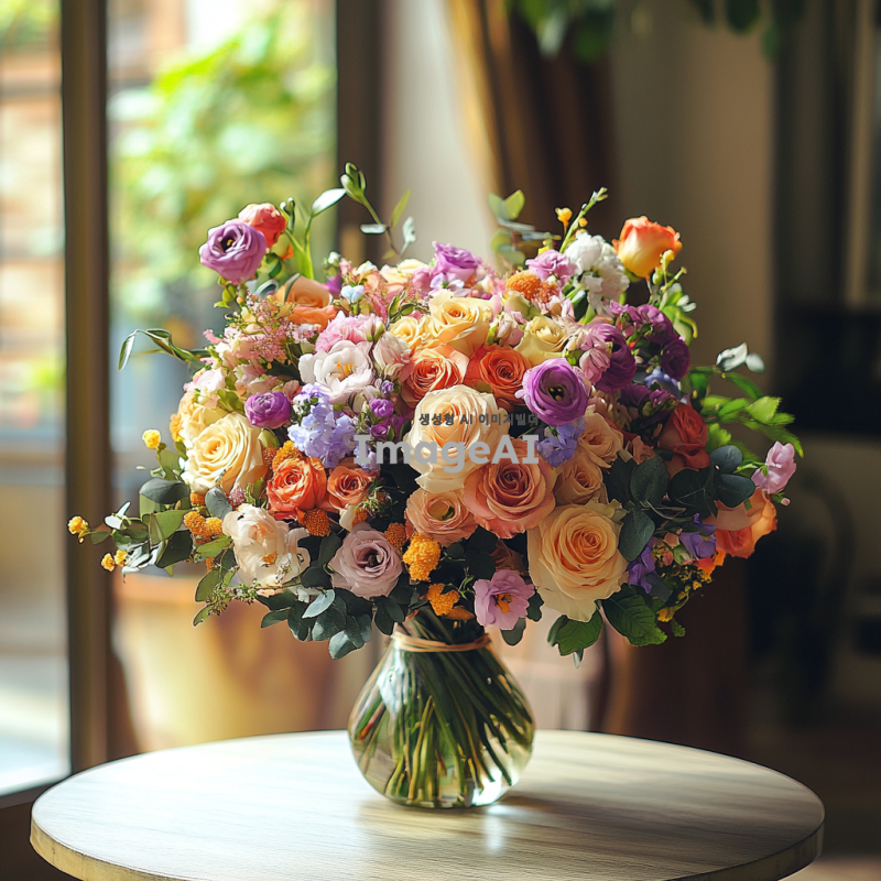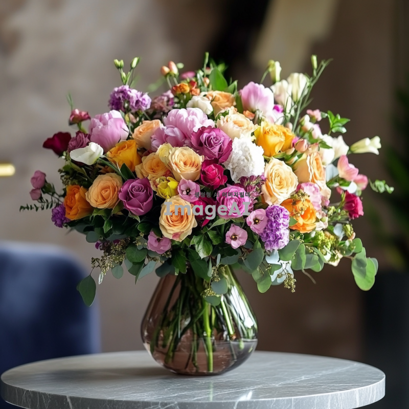 테이블 위에 놓인 화병에 화려하게 꽃힌 고급스러운 꽃다발, 다양한 색상의 꽃들이 조화롭게 어우러져 있는 모습, 부드러운 자연광이 비추는 분위기, 세련된 인테리어 배경, 고급스러운 느낌을 강조한 장면.