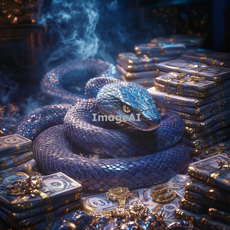 신비한 세계의 크고 굵은 파란 뱀이 중심에 자리 잡고 있으며, 그 주위에는 셀 수 없이 많은 돈다발과 화려한 보석들이 가득 쌓여 있다. 연기가 자욱하게 퍼져 있어 신비로운 분위기를 자아내고, 황홀한 느낌이 감도는 장면을 담고 있다. 부자의 소유를 상징하는 화려한 배경과 함께, 뱀의 비늘이 반짝이며 신비로운 매력을 발산하는 모습.