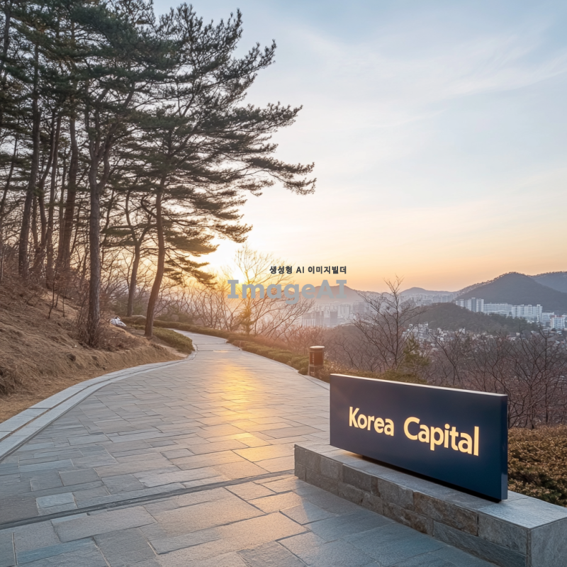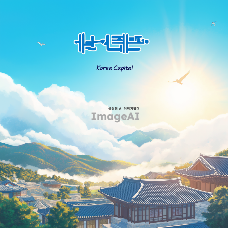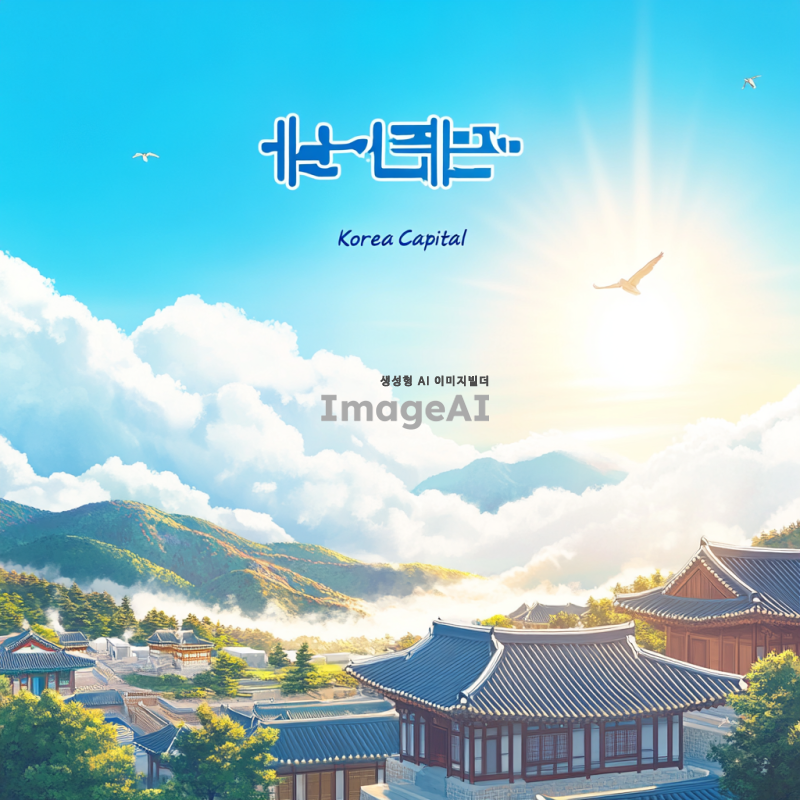 2025년 새해의 희망찬 아침, 떠오르는 태양과 함께 아름다운 한국의 풍경이 펼쳐진 모습. 하늘은 밝고 푸르며, 태양의 따뜻한 빛이 자연을 감싸고 있다. foreground에는 "한국캐피탈"이라는 문구가 세련된 글씨체로 배치되어 있어, 새로운 시작과 희망을 상징하는 느낌을 준다. 전체적으로 긍정적이고 활기찬 분위기를 전달하는 이미지.