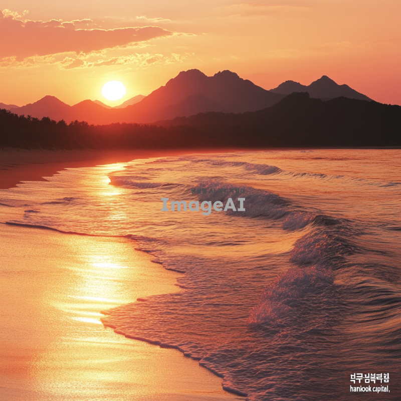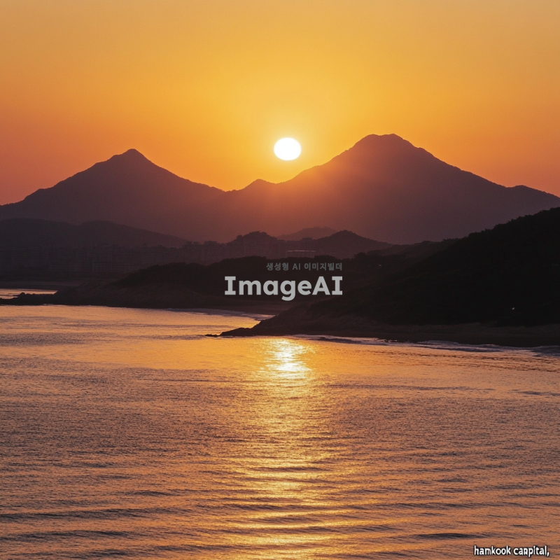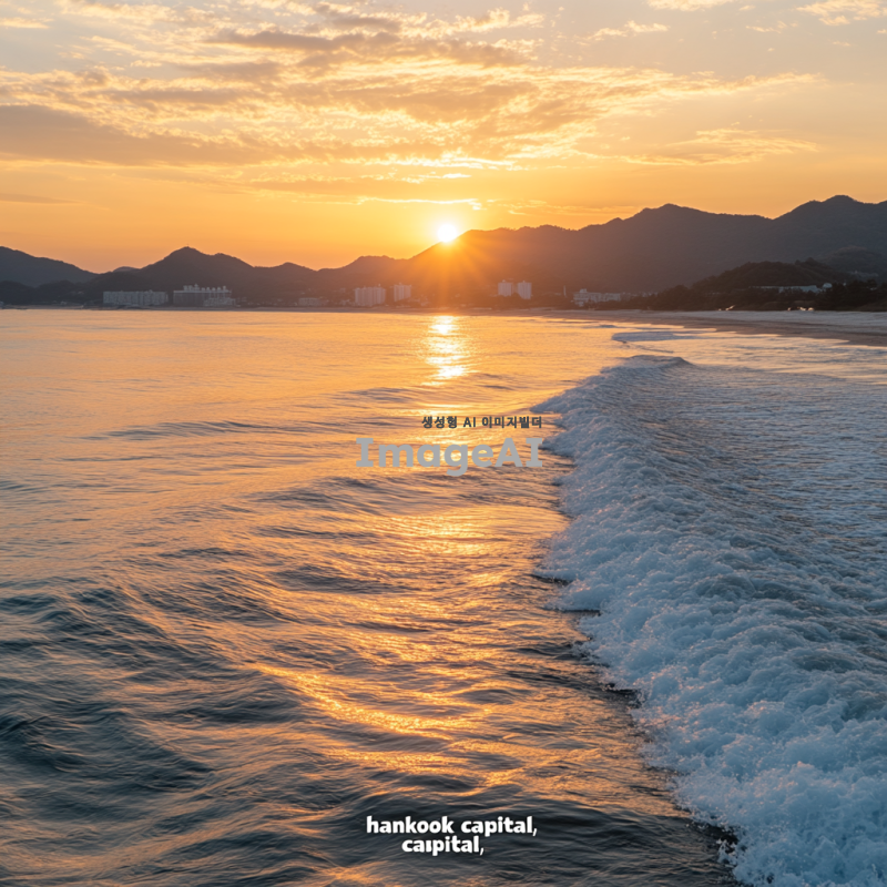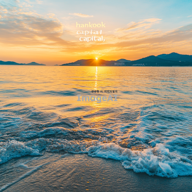 2025년 새해가 떠오르는 장면, 바다 또는 산에서 해가 떠오르는 모습, 따뜻한 색감의 하늘과 반사되는 물결, "hankook capital"이라는 문구가 자연스럽게 포함된 풍경, 한국의 아름다운 자연을 배경으로 한 이미지.