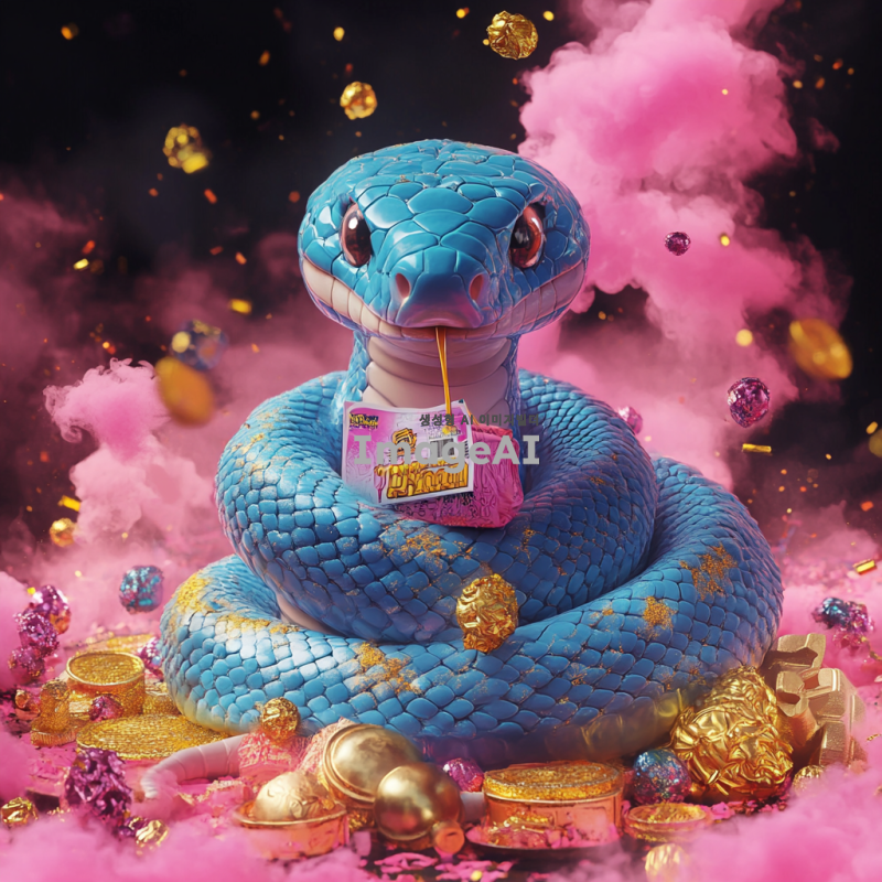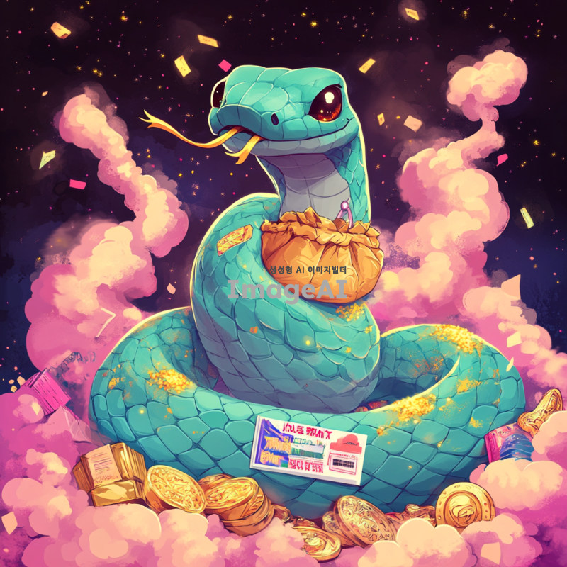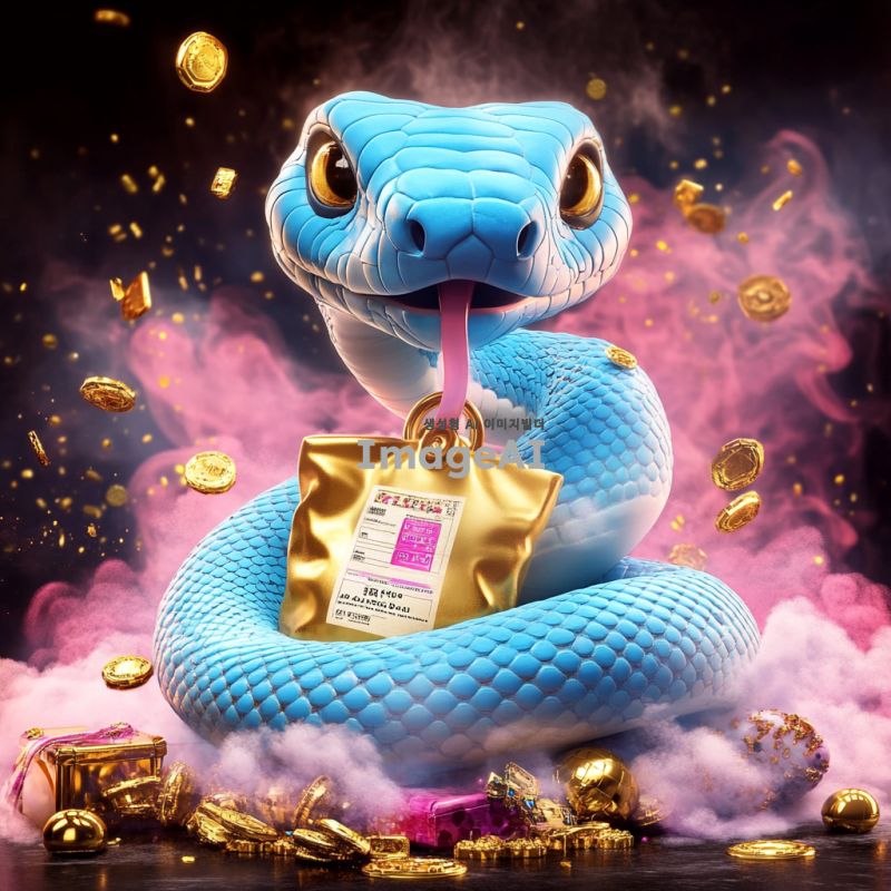 블랙과 핑크 배경에 푸른색 크고 굵은 귀여운 뱀이 복주머니를 목에 두르고 있으며, 뱀 주변에는 연기가 피어오르고 황금가루가 뿌려져 있다. 주위에는 금은보화가 넘치고, 가운데에는 로또 1등 복권 종이가 놓여 있다.