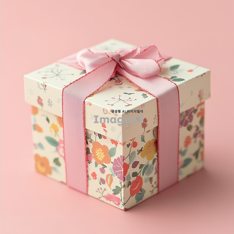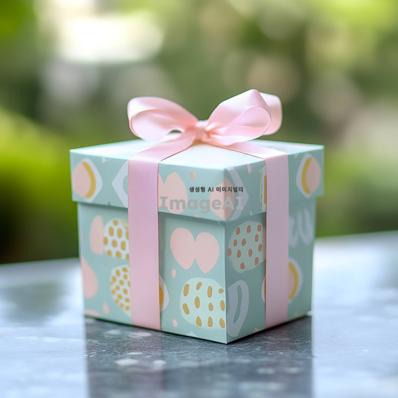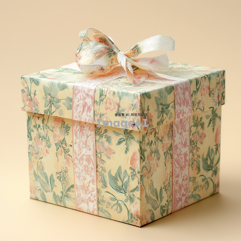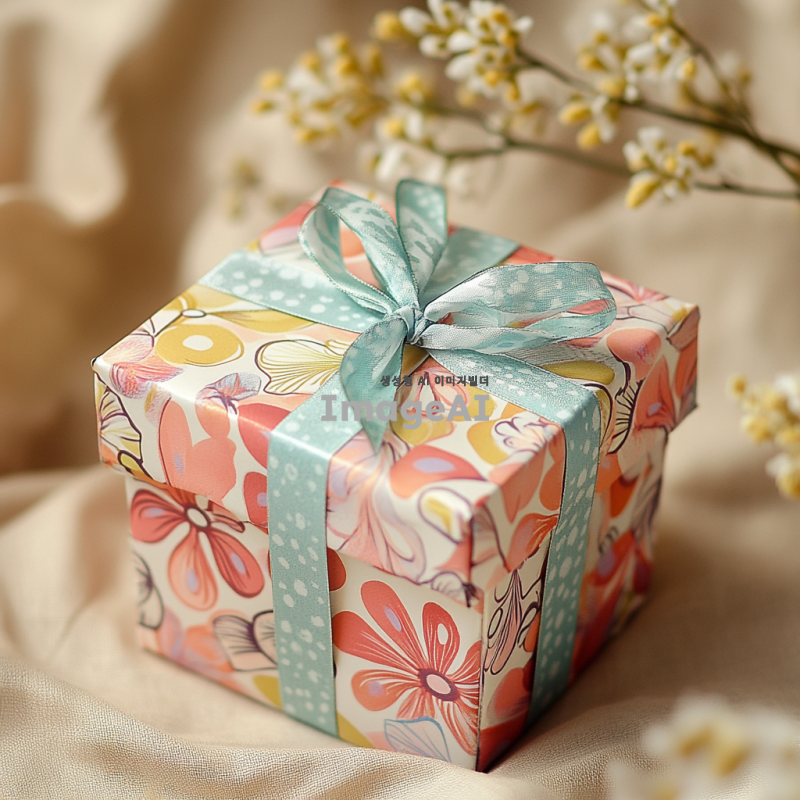 종이로 된 선물상자가 아름답게 포장되어 있고, 화려한 리본으로 장식된 모습. 상자는 다양한 색상의 패턴으로 꾸며져 있으며, 배경은 따뜻한 느낌의 부드러운 색조로 설정되어 있다. 상자 위에는 섬세하게 매듭지어진 리본이 있어, 선물의 특별함을 강조하고 있다.