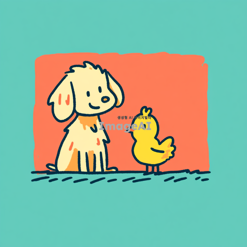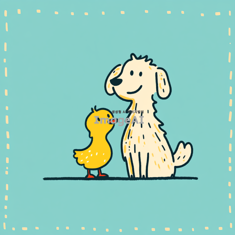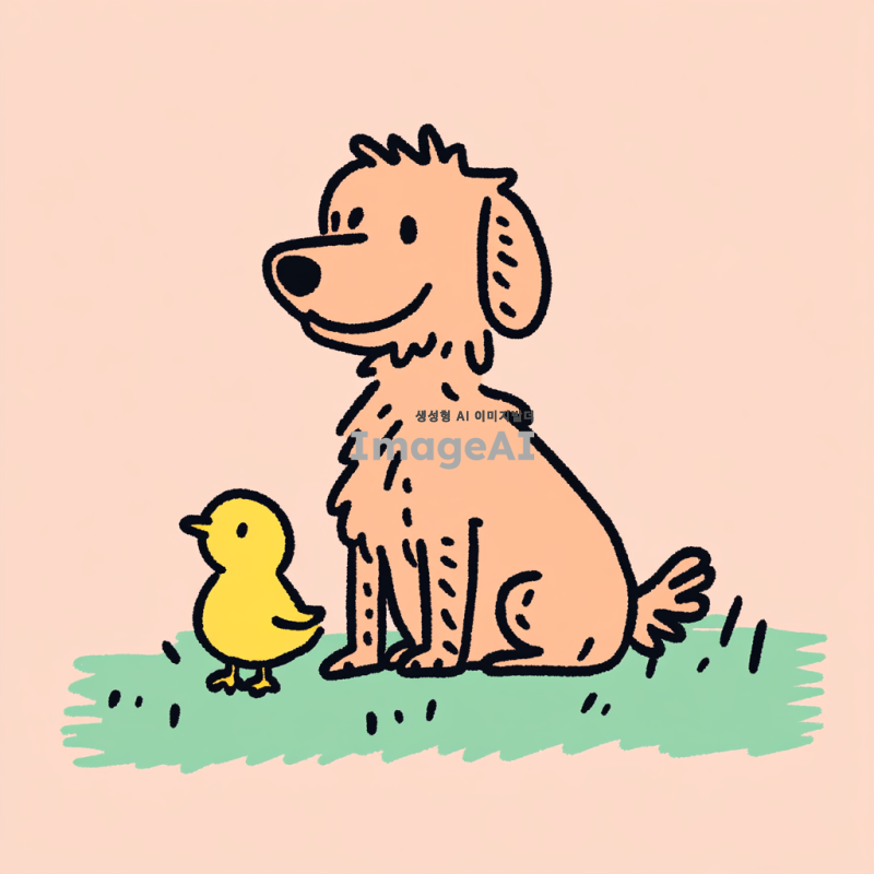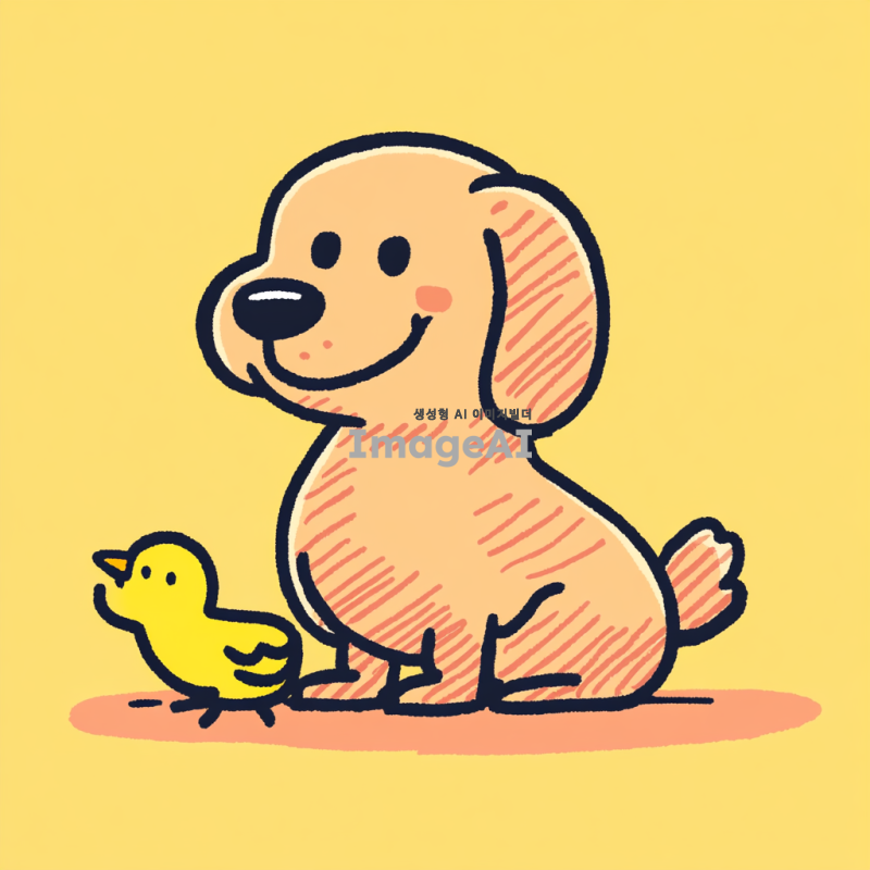 앉아있는 리트리버의 다리 사이에 병아리가 있는 장면을 애니메이션 스타일로 그려줘. 리트리버는 부드러운 털과 귀여운 표정을 지니고 있으며, 병아리는 노란색 털로 귀엽고 활기차게 보인다.
