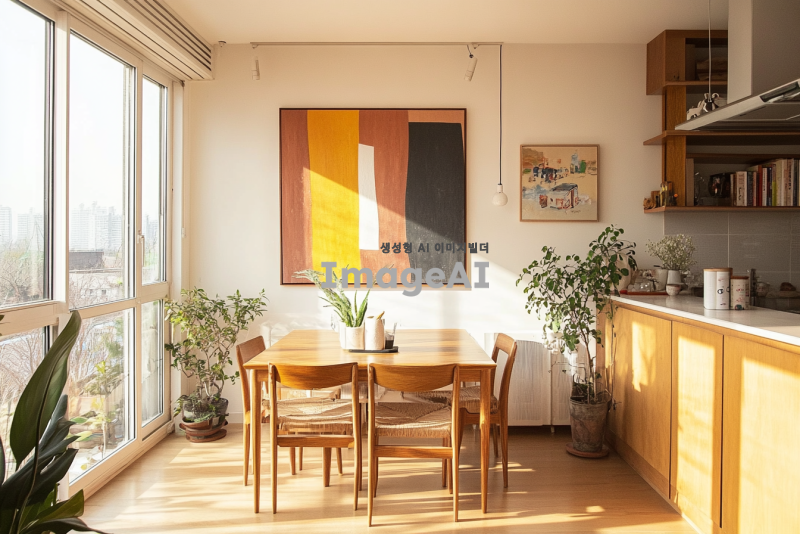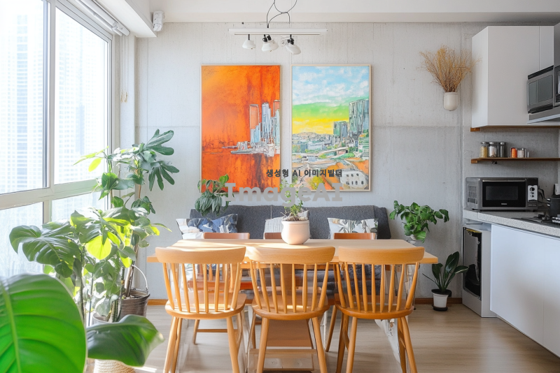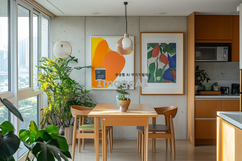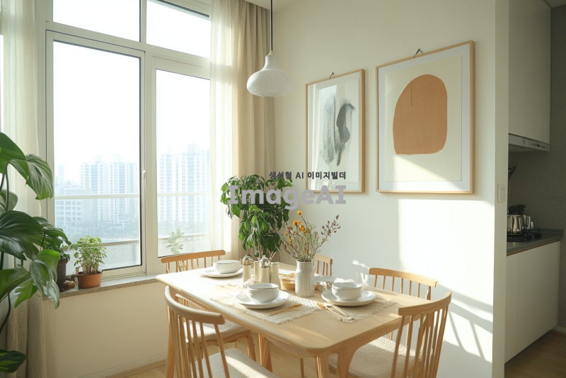 4인용 세라믹 식탁세트가 놓여 있는 한국 모던 아파트의 주방 다이닝룸 인테리어. 벽에는 밝고 따뜻한 느낌의 그림 액자가 걸려 있으며, 중간 크기의 식물로 포인트를 주어 아늑하고 세련된 분위기를 연출하고 있다. 자연광이 들어오는 창문과 함께 현대적인 디자인의 가구들이 조화를 이루고 있는 모습.