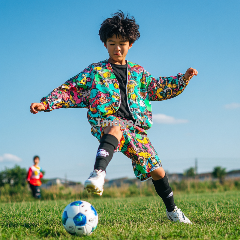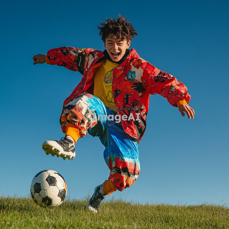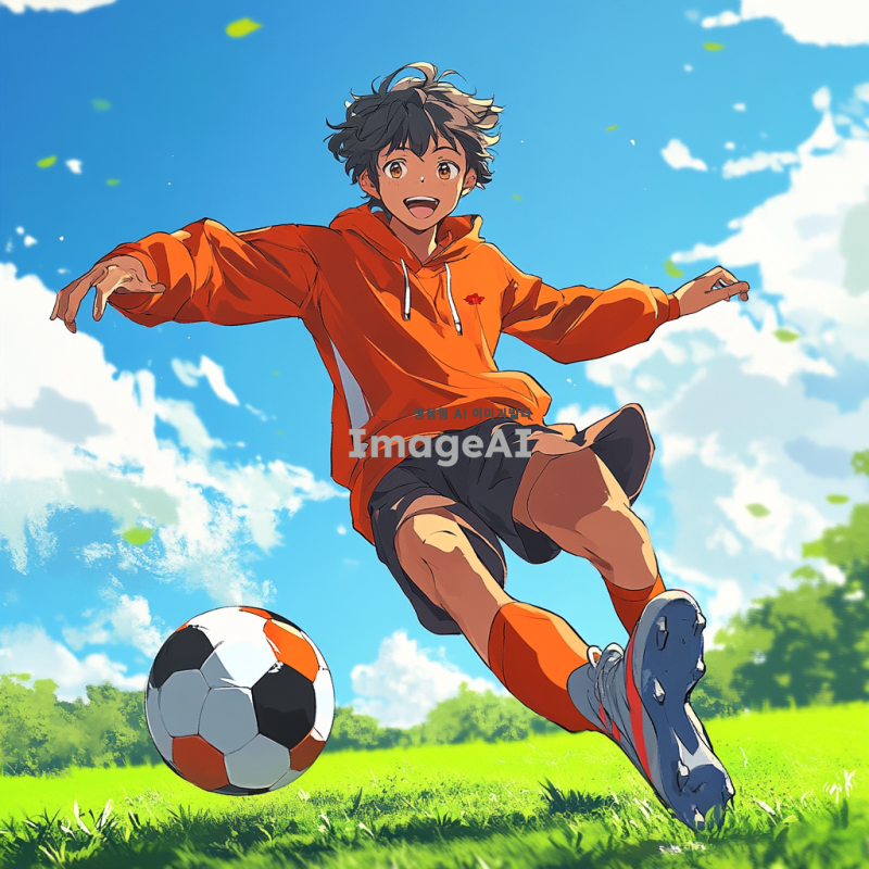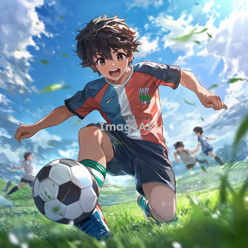 운동을 좋아하는 열네 살 남학생, 신나는 운동복을 입고 축구공을 차고 있는 모습, 배경은 푸른 잔디밭과 맑은 하늘, 활기차고 에너지가 넘치는 표정, 친구들과 함께 있는 장면, 운동에 대한 열정이 느껴지는 모습