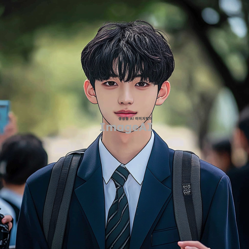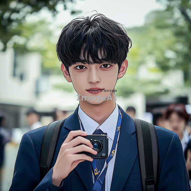 중학교 교복을 입고 증사를 찍고있는 남학생