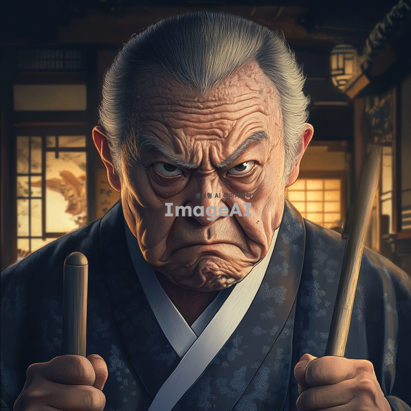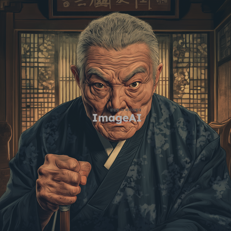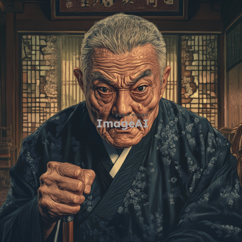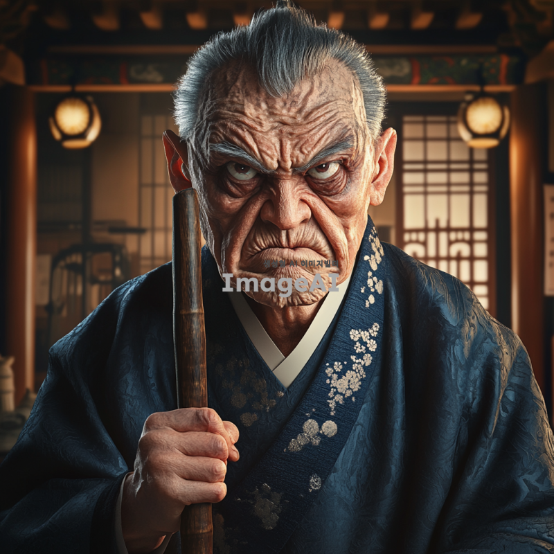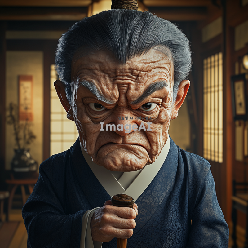 화가 난 표정을 짓고 있는 한국인 할아버지의 모습. 주름진 얼굴과 날카로운 눈빛이 특징이며, 손에는 지팡이를 쥐고 있다. 배경은 전통적인 한국의 집안 풍경으로, 고풍스러운 가구와 함께 따뜻한 조명이 비추고 있다. 할아버지의 복장은 한복으로, 색상은 짙은 남색과 회색이 조화롭게 어우러져 있다.
