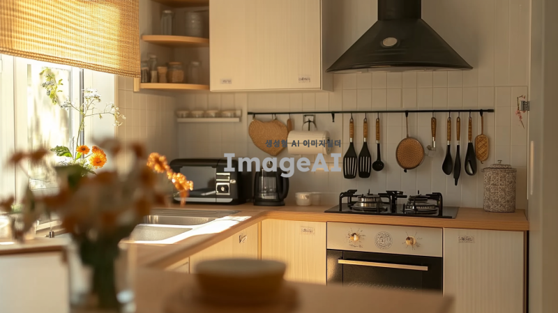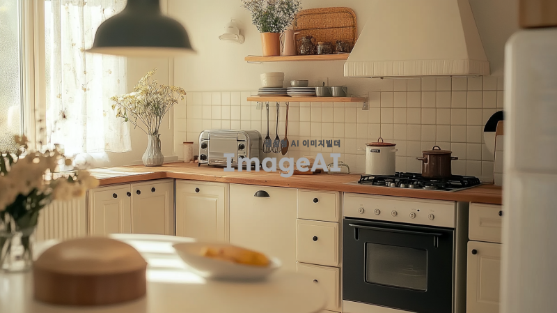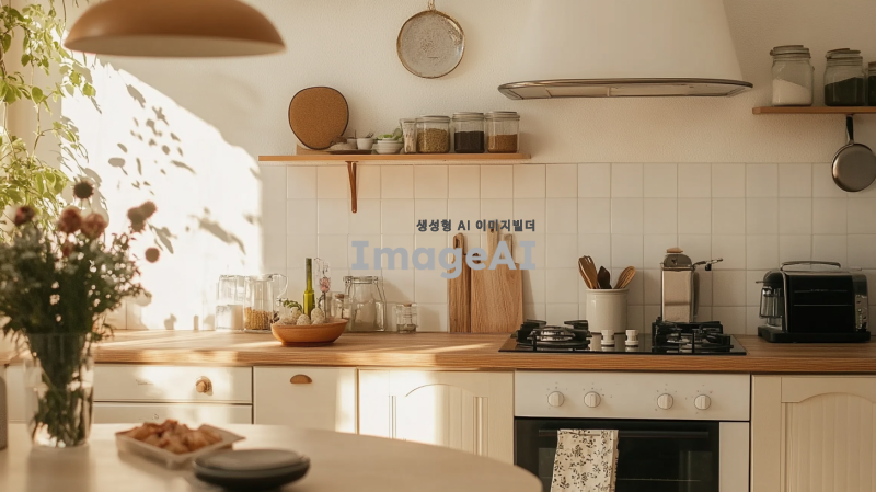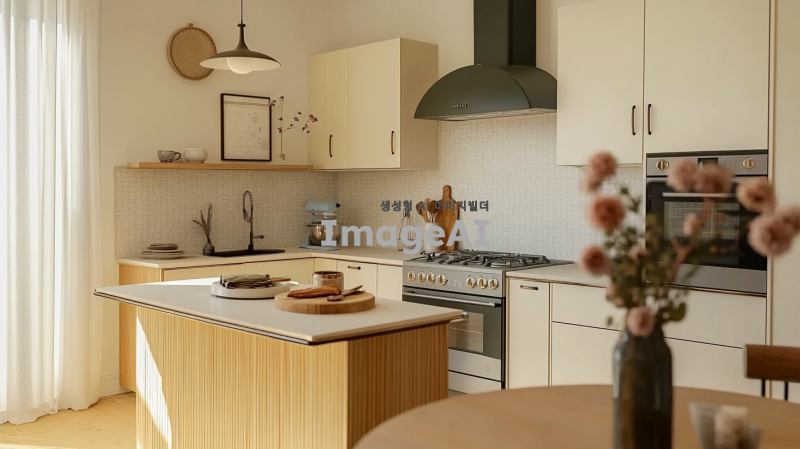 따뜻한 조명과 화이트, 연한우드, 베이지색의 주방. 전자제품들 없고 꽃도 없고 깔끔하고 심플. 모던한 느낌