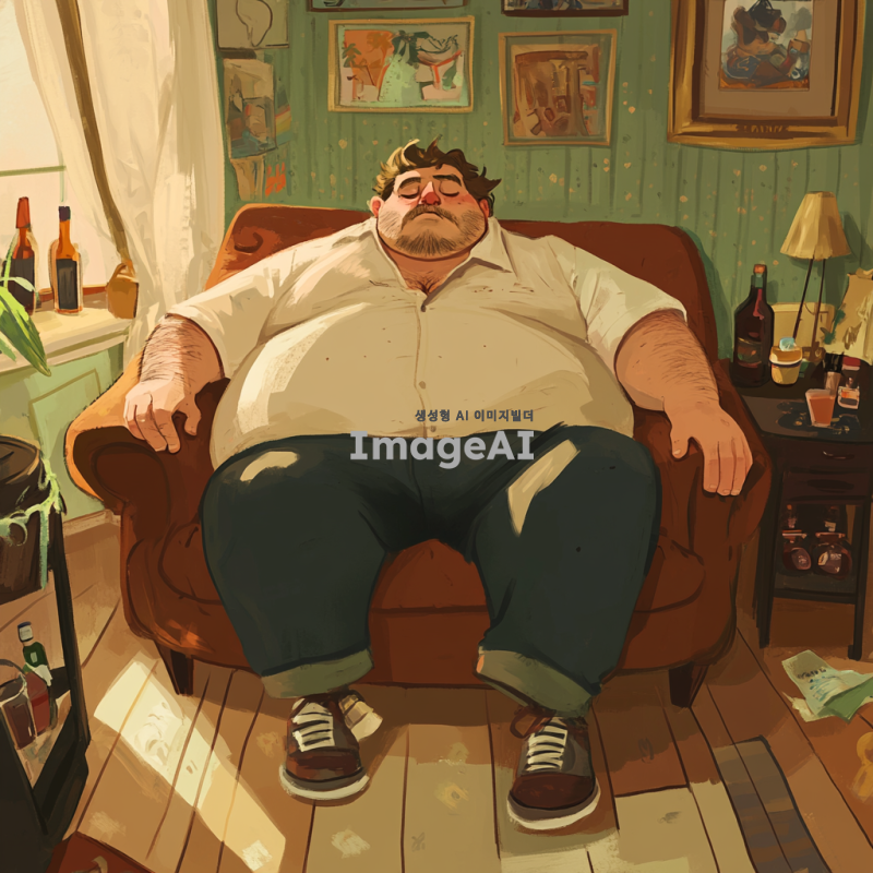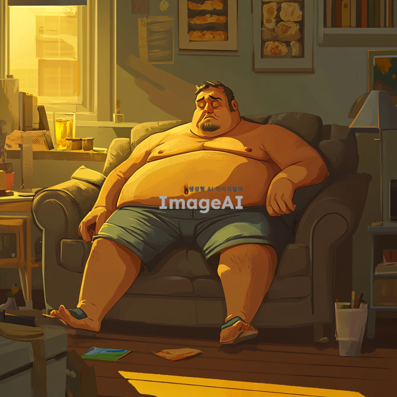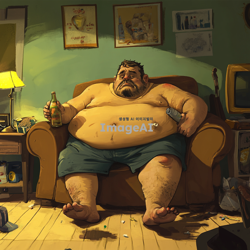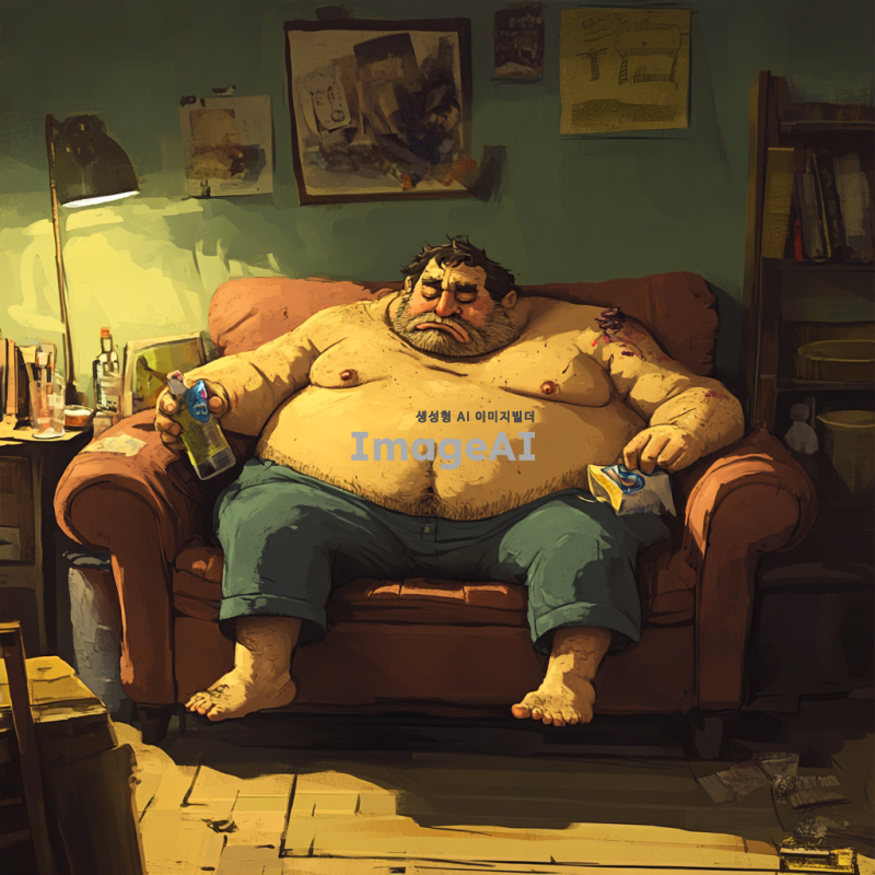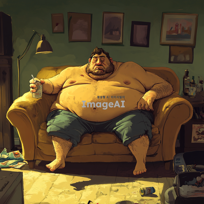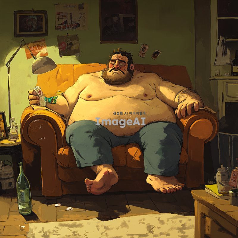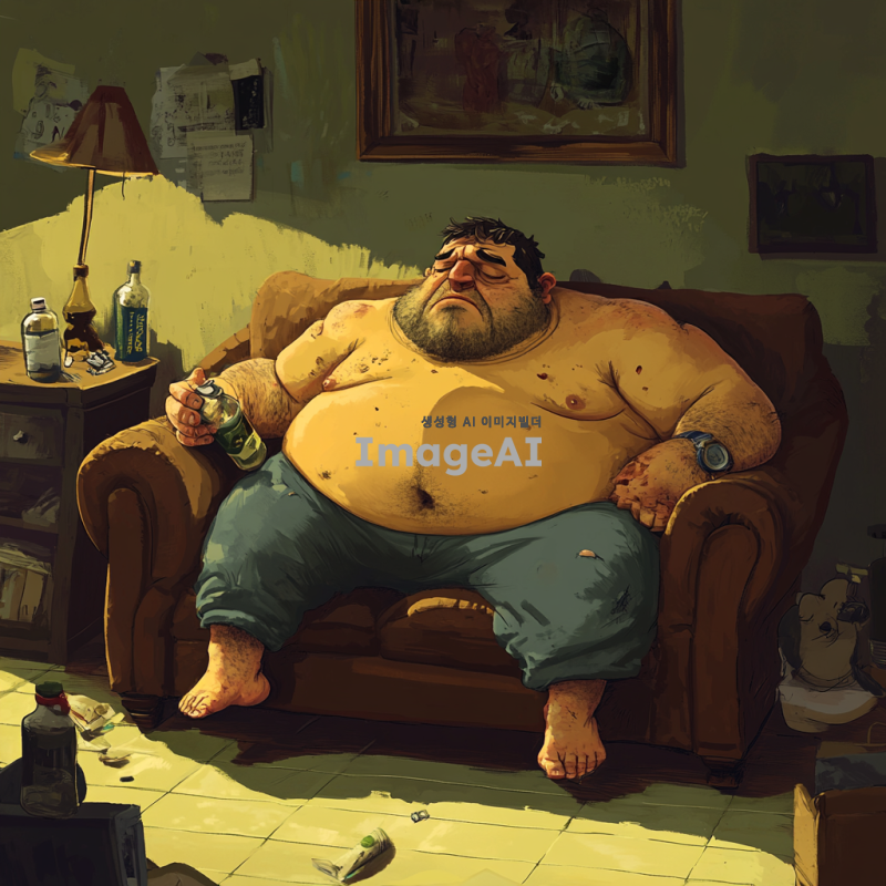 뚱뚱하고 냄새나는 남성이 소파에 앉아있고 주위 물건도 관리를 하지 않아 냄새가 심함. 그림체는 2d에 만화, 일러스트 같은 그림체