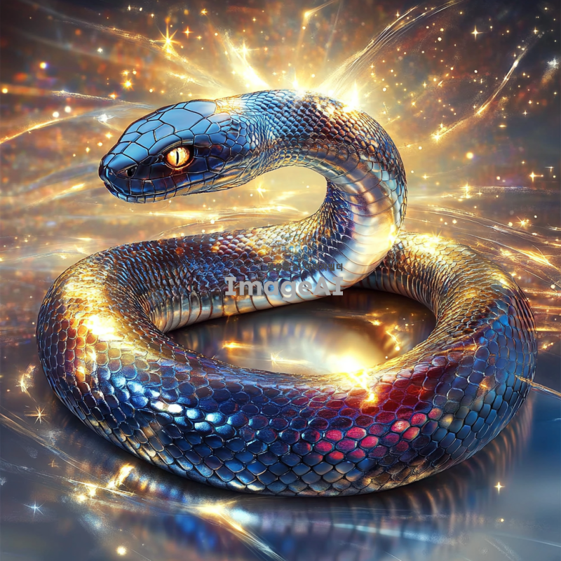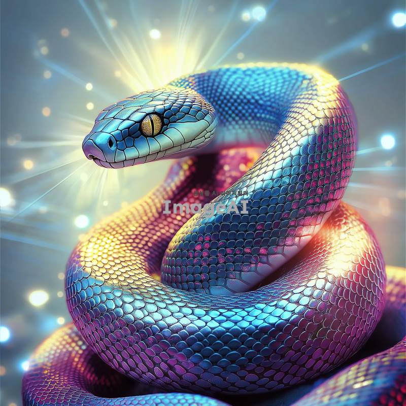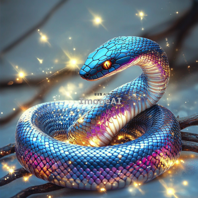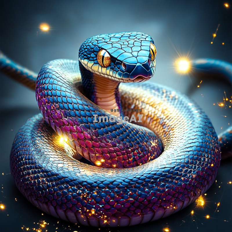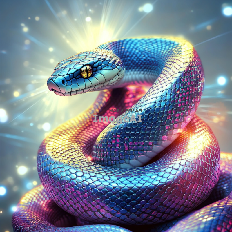 푸른 뱀의 몸체에 다양한 색깔이 어우러져 있는 모습, 금색으로 빛나는 효과가 강조된 그림, 자연의 배경 속에서 뱀이 우아하게 움직이는 장면, 생동감 넘치는 색감과 빛의 반사가 돋보이는 스타일.