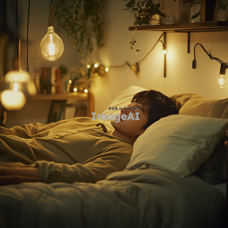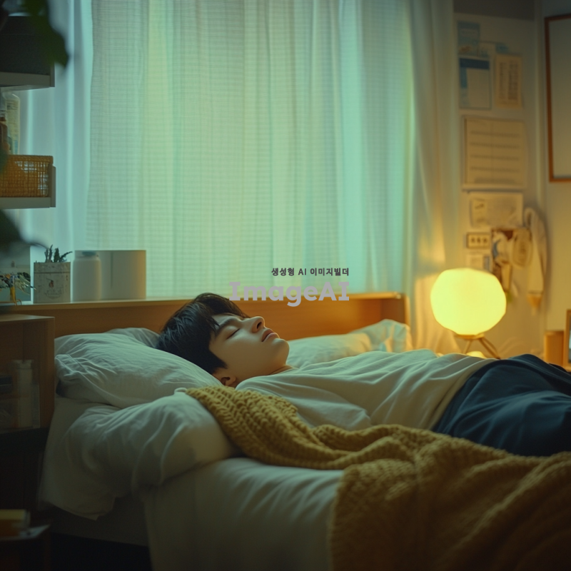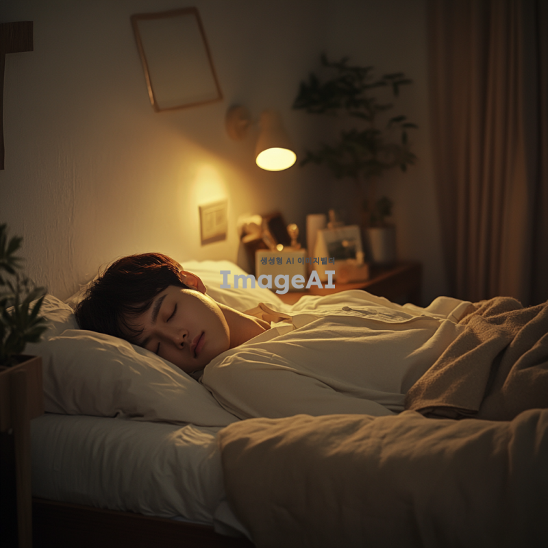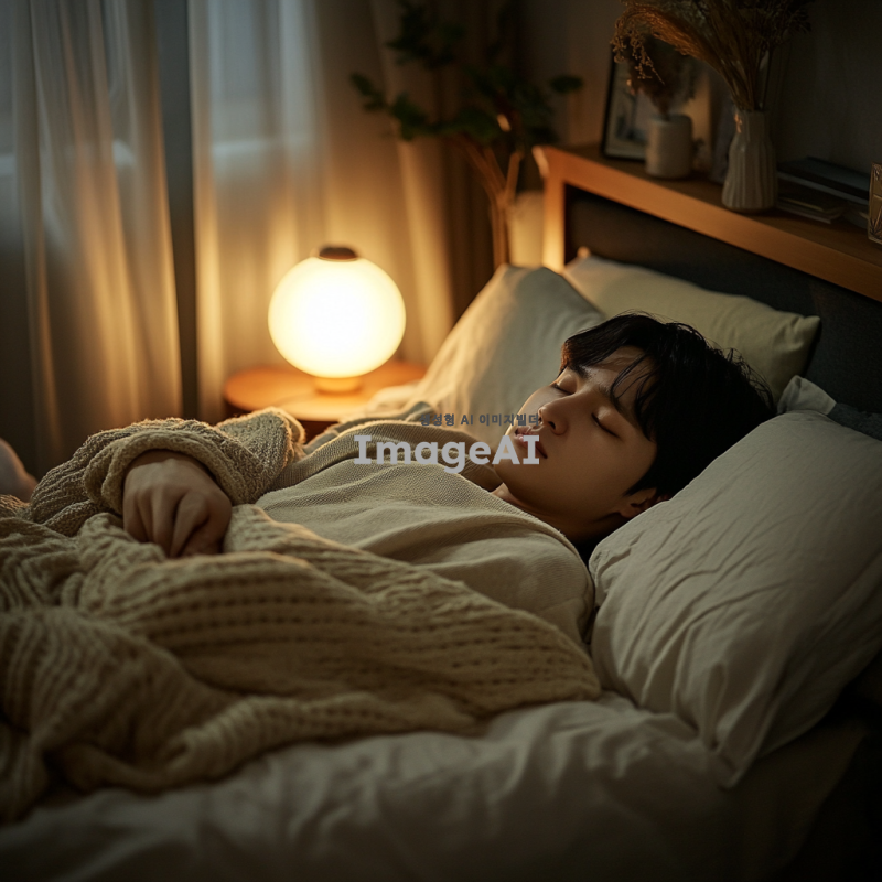 편안한 침실에서 깊은 잠에 빠진 한국인 남성의 모습, 부드러운 조명이 비추는 아늑한 분위기, 편안한 침대와 포근한 이불, 평화로운 표정으로 잠들어 있는 모습, 주변에 아늑한 인테리어 소품들이 어우러진 장면.
