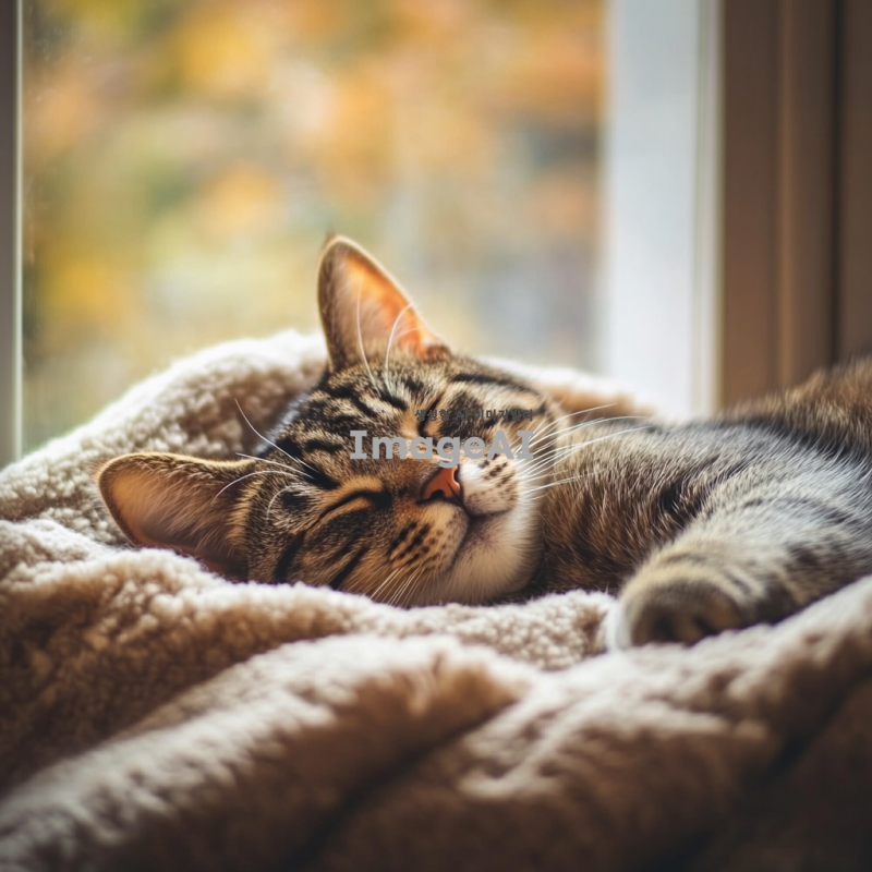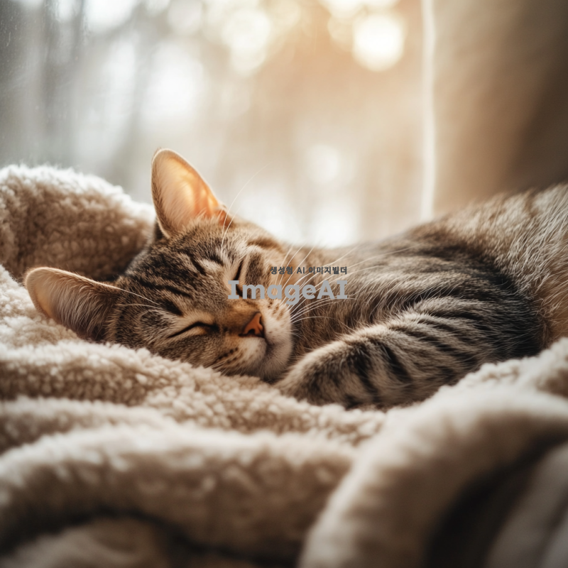 고양이가 편안하게 자고 있는 모습, 부드러운 이불 위에 누워 있는 귀여운 고양이, 햇살이 비치는 창가에서 꿈꾸는 듯한 표정, 따뜻한 색감과 아늑한 분위기, 고양이의 털이 부드럽고 윤기 나는 모습, 배경은 아늑한 방의 인테리어로 설정.