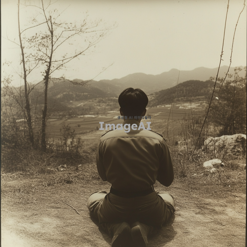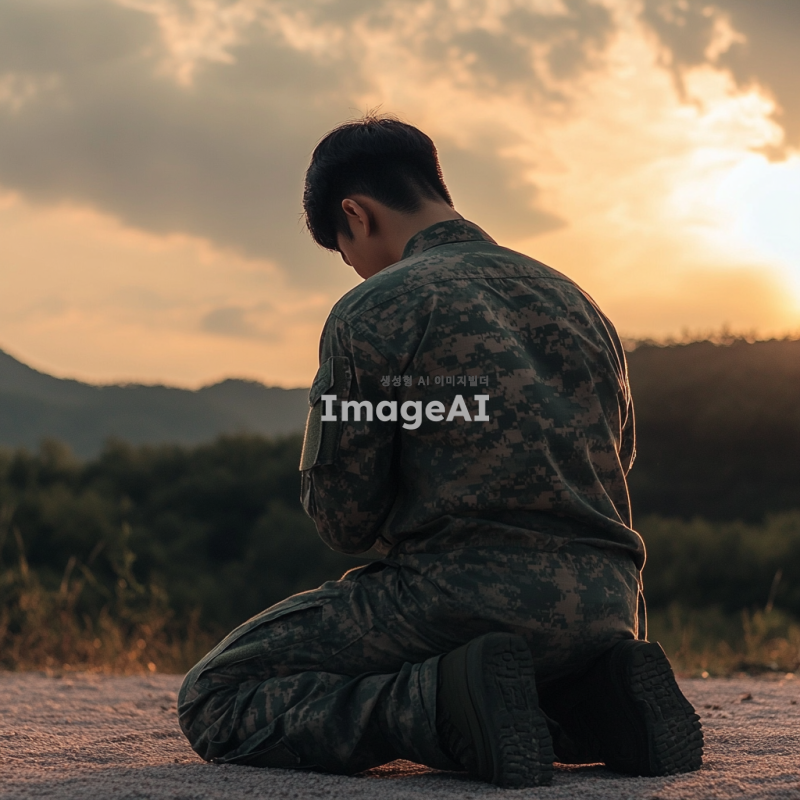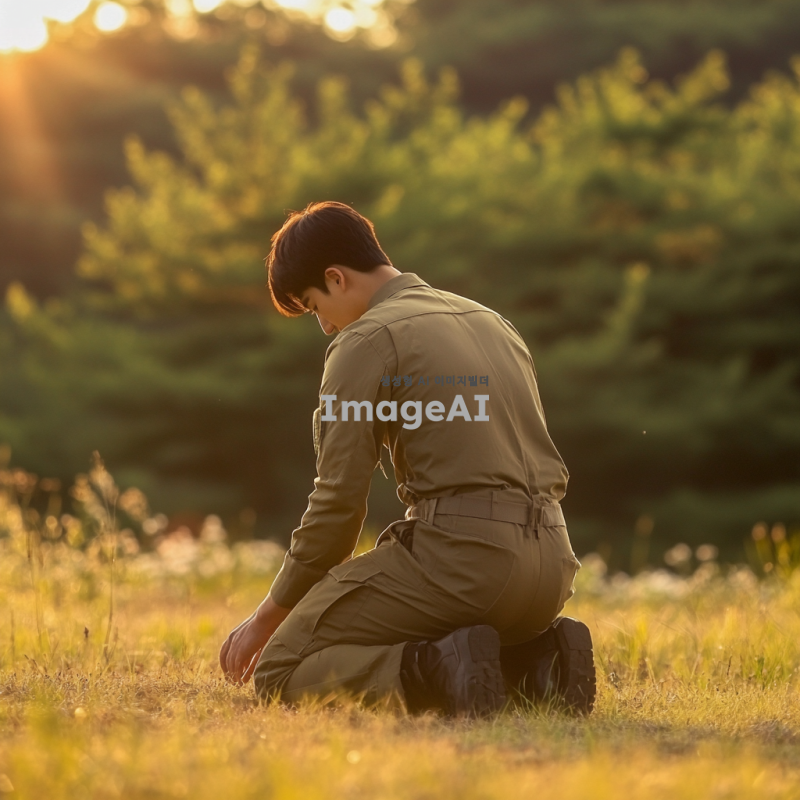 20세 한국 남자가 군복을 입고 무릎을 꿇고 엎드려 절하는 모습의 뒷모습, 긴 바지를 입고 있으며 근육질의 긴 다리를 가진 모습, 배경은 자연 풍경으로 설정, 조명은 부드럽고 따뜻한 느낌.