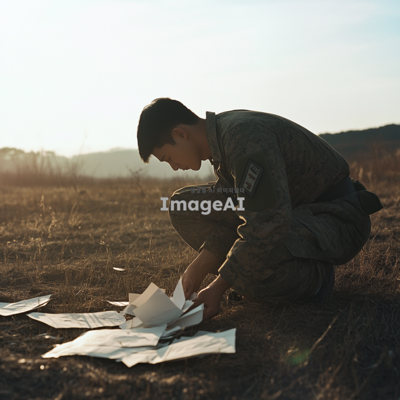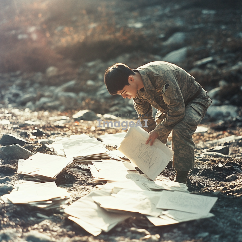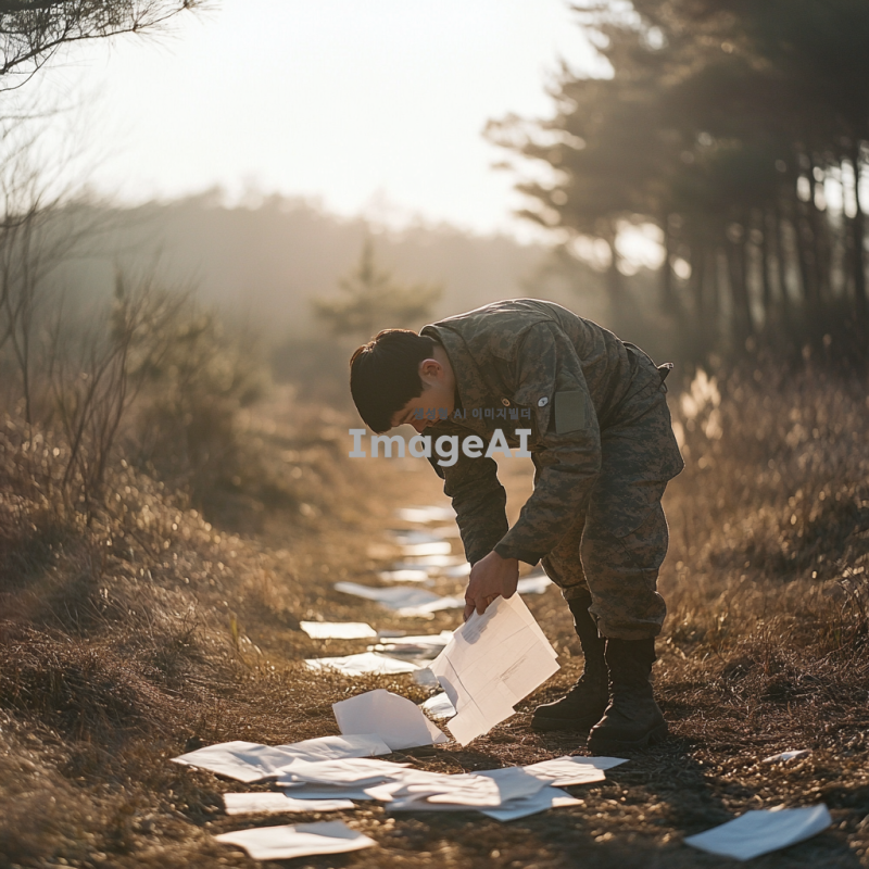 바닥에 떨어진 종이를 줍고 있는 20대 한국 군인의 뒷모습, 군복을 입고 있으며, 주변에는 자연 풍경이 펼쳐져 있고, 햇빛이 부드럽게 비치고 있는 장면. 군인의 자세는 집중하고 있는 모습이며, 상체를 숙이고 있고, 바닥에는 여러 장의 종이가 흩어져 있음.