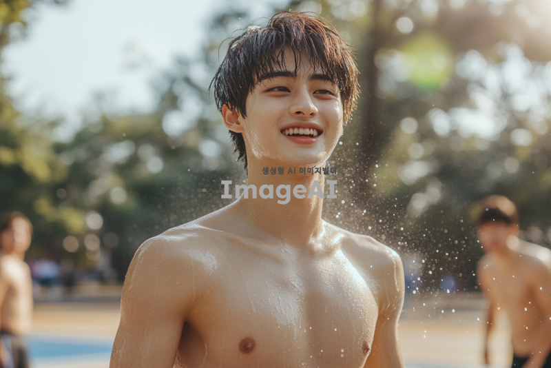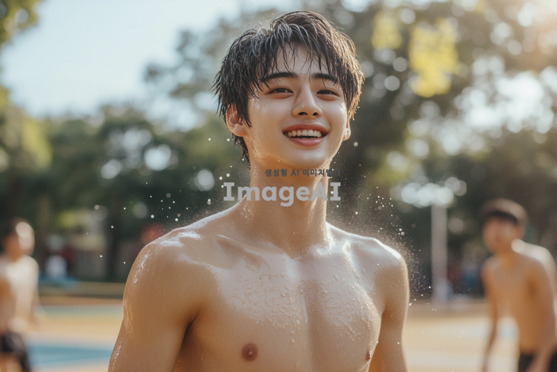 잘생긴 16살 한국 남학생이 농구를 마친 후 더위에 지쳐 상의를 탈의하고 땀을 흘리며 미소 짓고 있는 모습. 배경은 농구 코트로, 햇빛이 강하게 비추고 있고, 주변에 농구공과 친구들이 있는 장면.