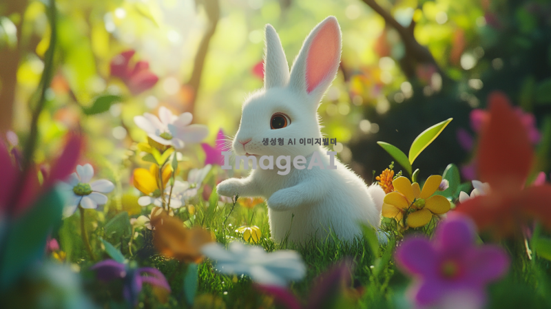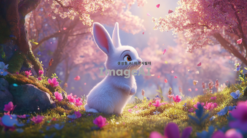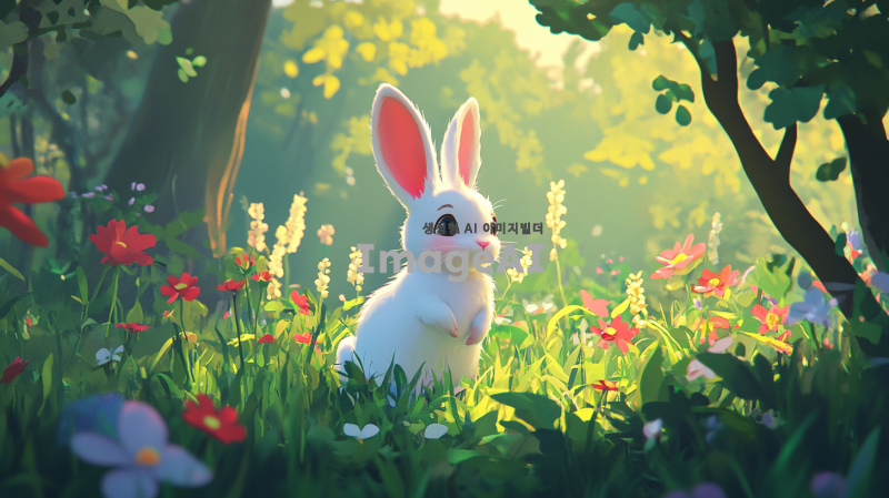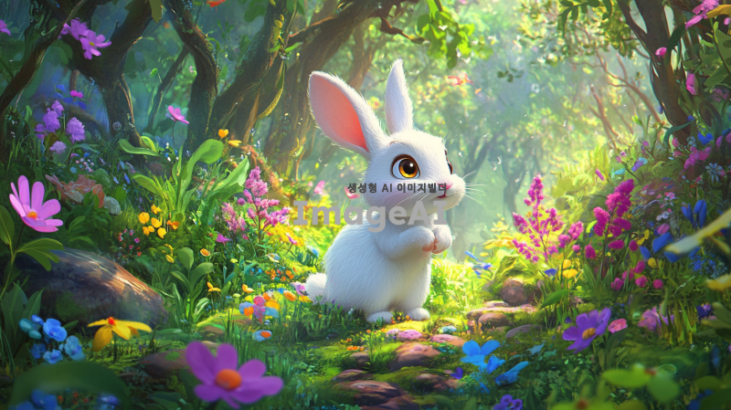 귀여운 흰 토끼가 숲 속에 서 있고, 다채로운 꽃들과 나무들로 둘러싸여 있으며, 픽사 스타일로, 만화 캐릭터 디자인으로, 디즈니 스타일로, 부드러운 조명, 밝은 색상, 고해상도, 높은 세부사항, 높은 품질, 고화질, 높은 초점, 최고의 품질, 최고의 세부사항, 최고의 색상 그레이딩, 최고의 렌더링.