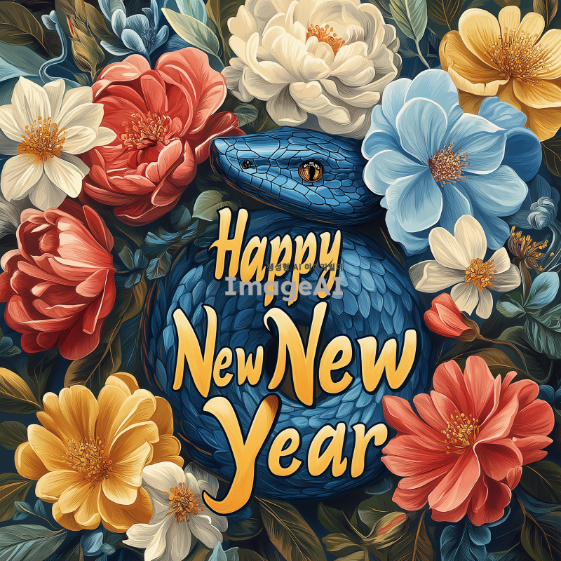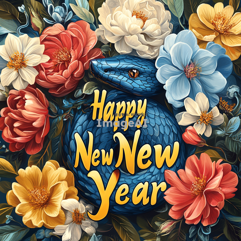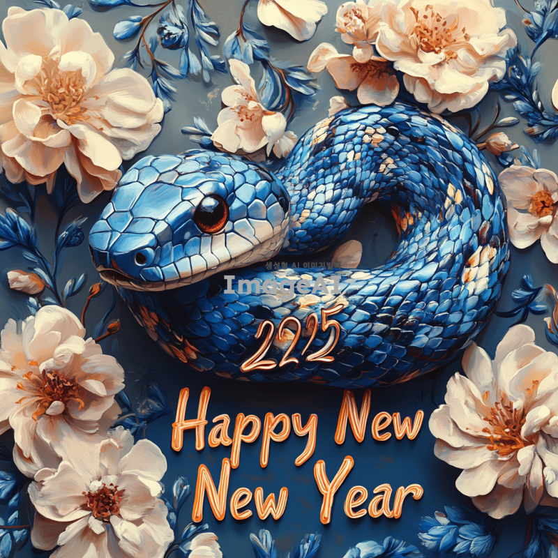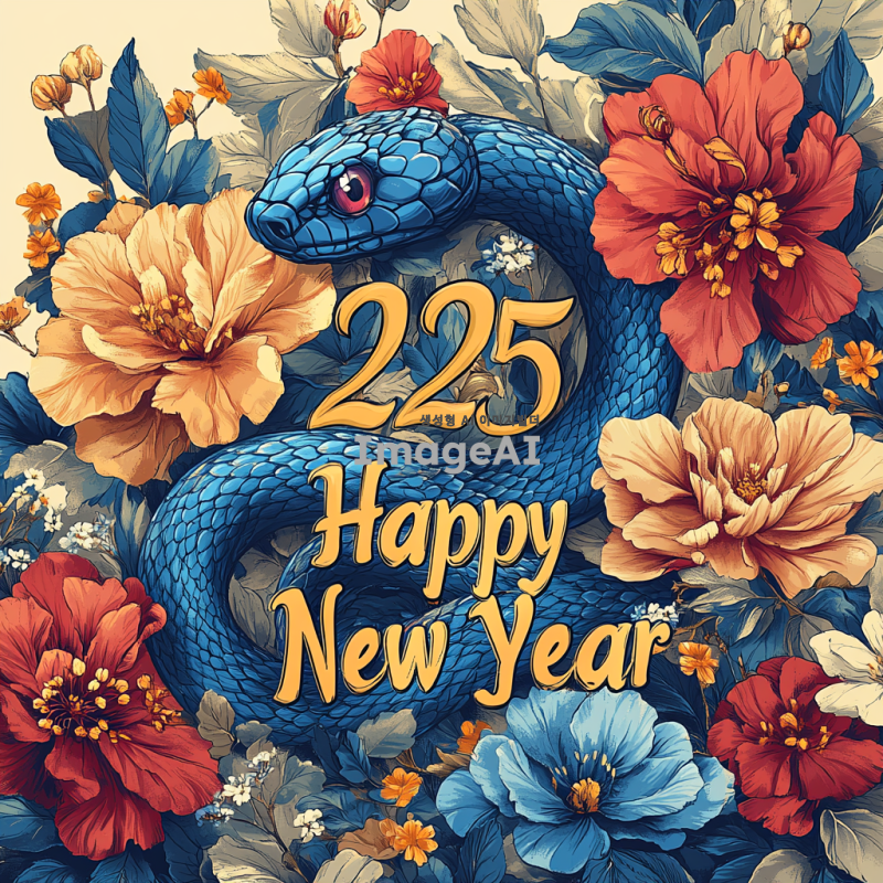 파란색 꽃무늬 뱀을 중심으로 2025라는 숫자를 디자인하고, 그 아래에 "새해 복 많이 받으세요."라는 문구를 넣은 이미지. 뱀의 세부 묘사와 꽃무늬의 아름다움이 강조되도록 구성. 배경은 부드러운 색조로 조화롭게 어우러지게 연출.