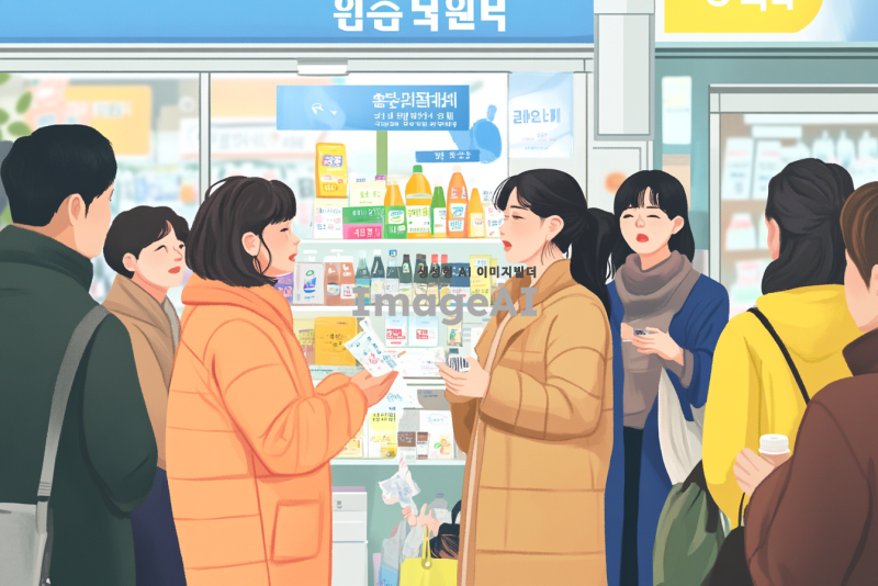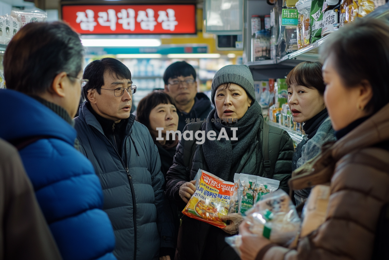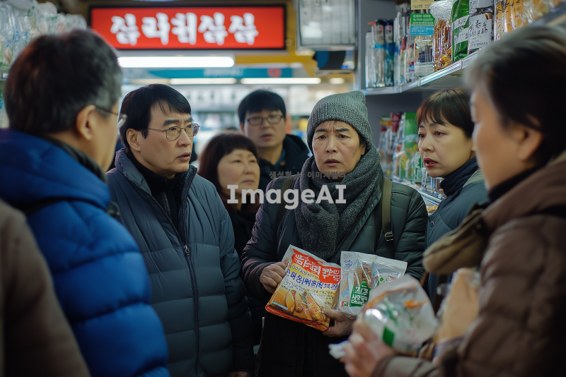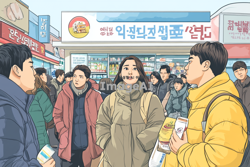 소비자들이 기업의 제품에 대해 비판하는 장면, 다양한 연령대와 성별의 한국인 소비자들이 모여서 불만을 이야기하고 있는 모습, 배경에는 기업 로고가 보이는 상점이나 광고판, 소비자들의 표정은 진지하고 불만이 가득한 모습, 손에 제품을 들고 있거나 불만을 나타내는 피켓을 들고 있는 모습, 주변에는 사람들이 관심을 가지고 지켜보는 장면.
