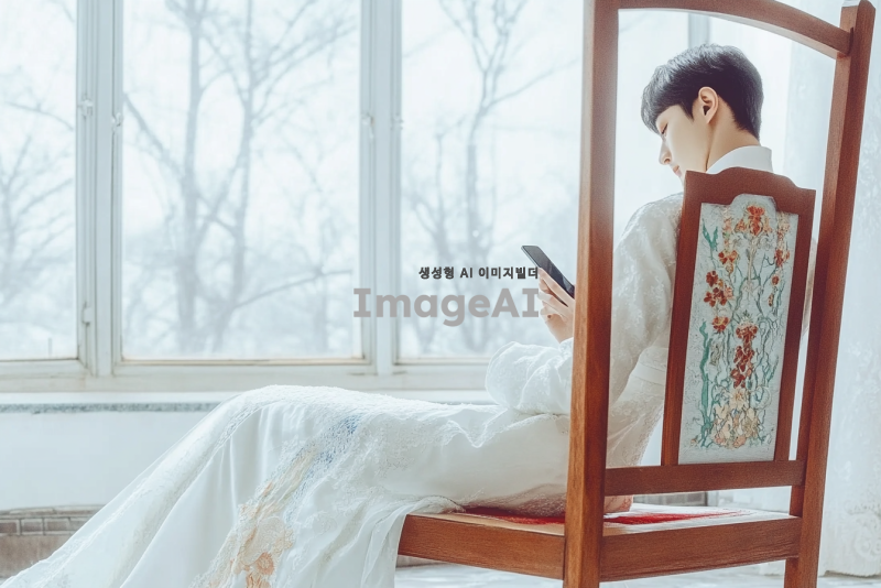 하얀 한복을 입고 나태하게 핸드폰을 보는 이순신, 현대적인 배경 속에서 편안한 자세로 앉아 있는 모습, 부드러운 조명 아래에서 고요한 분위기를 연출, 전통과 현대의 조화, 한국적인 요소가 가미된 장면.