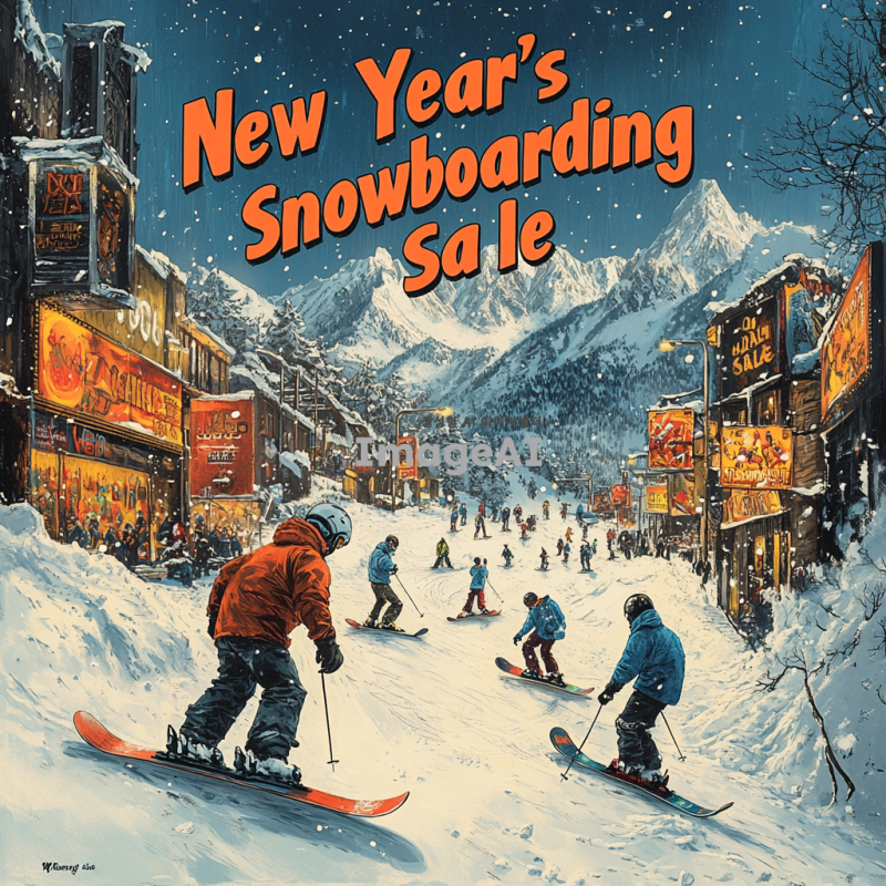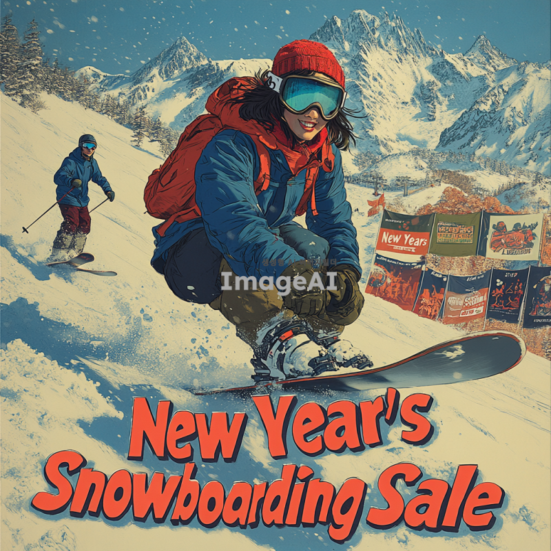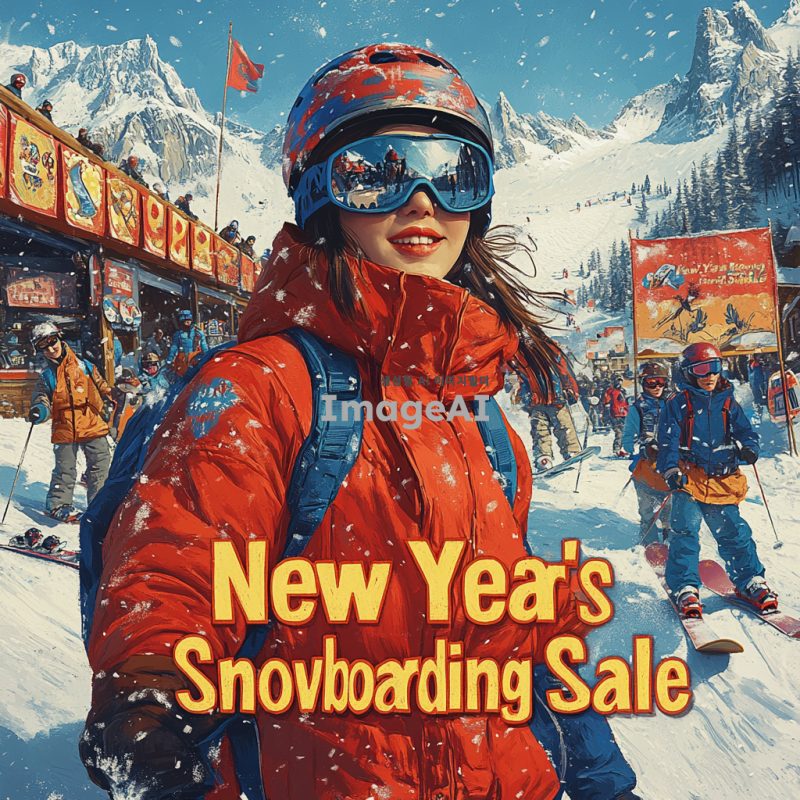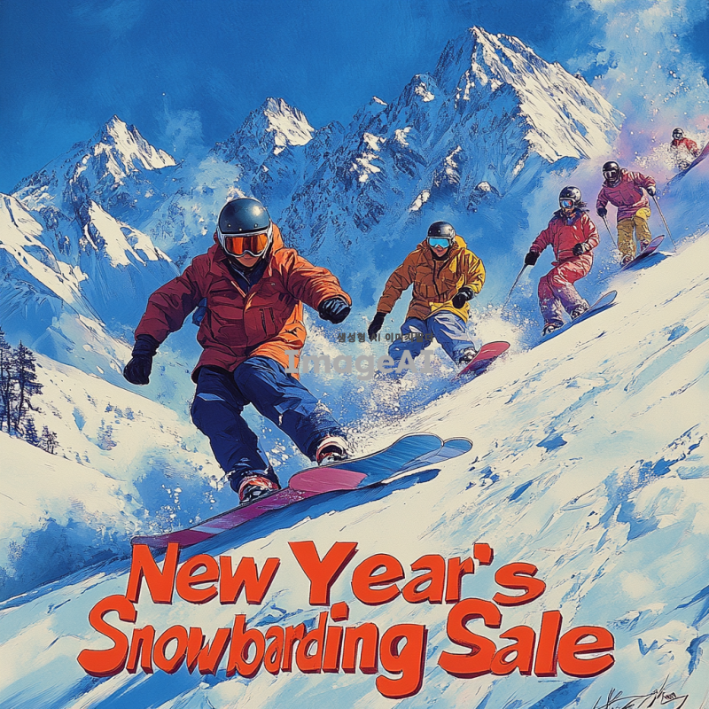 새해맞이 스노보드 세일을 홍보하는 포스터 디자인, 눈 덮인 산악 배경에 스노보드를 타는 한국인 젊은이들, 활기차고 즐거운 분위기, 다양한 스노보드 장비와 할인 가격이 적힌 배너, 따뜻한 색감으로 생동감 있게 표현, "새해맞이 스노보드 세일"이라는 문구가 눈에 띄게 배치된 이미지.