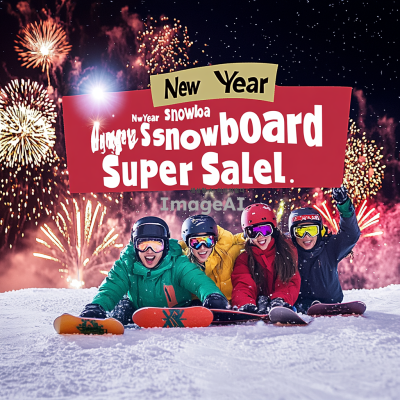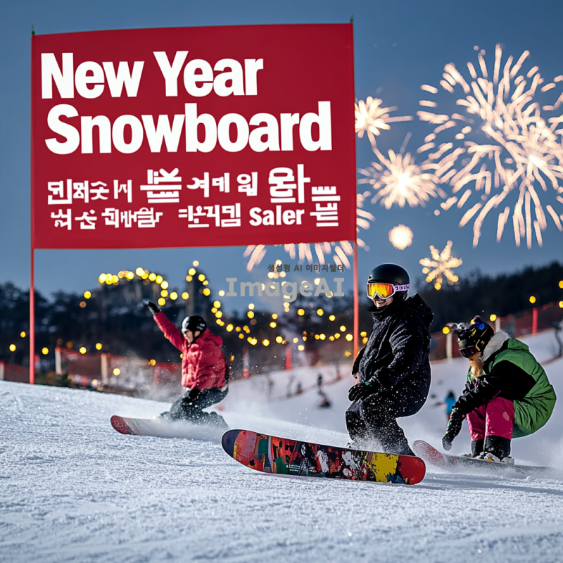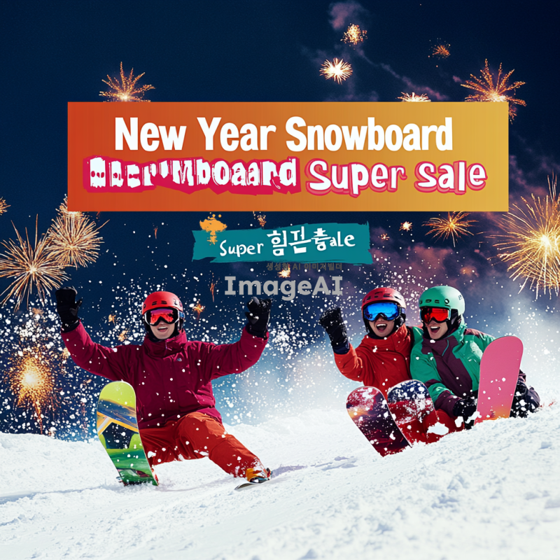 눈 덮인 산에서 스노보드를 타고 있는 한국인들, 화려한 스노보드 장비와 함께 즐거운 표정으로 새해를 맞이하는 모습, 배경에는 새해를 축하하는 불꽃놀이와 함께 "새해맞이 스노보드 슈퍼세일"이라는 텍스트가 적힌 배너, 밝고 경쾌한 분위기.