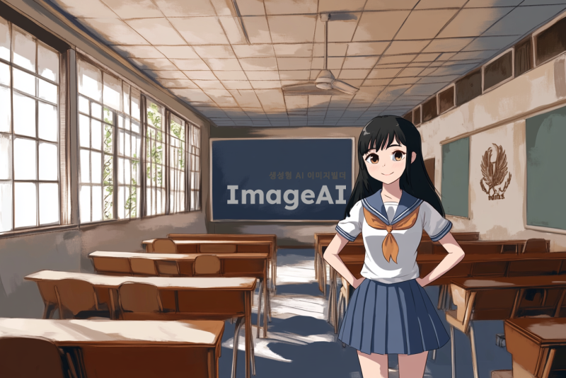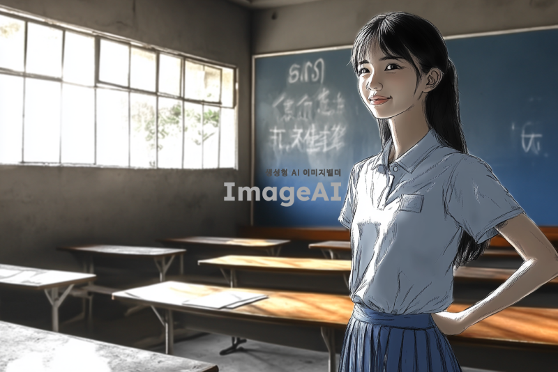 한 여학생이 자신감 넘치는 표정으로 가오를 부리며 서 있는 모습. 그녀는 긴 검은 머리를 가지고 있고, 교복을 입고 있다. 배경은 학교 교실로, 책상과 칠판이 보인다. 여학생의 자세는 당당하고, 손은 허리에 두고 있다. 그녀의 눈빛은 강렬하고, 미소를 지으며 자신을 표현하고 있다.