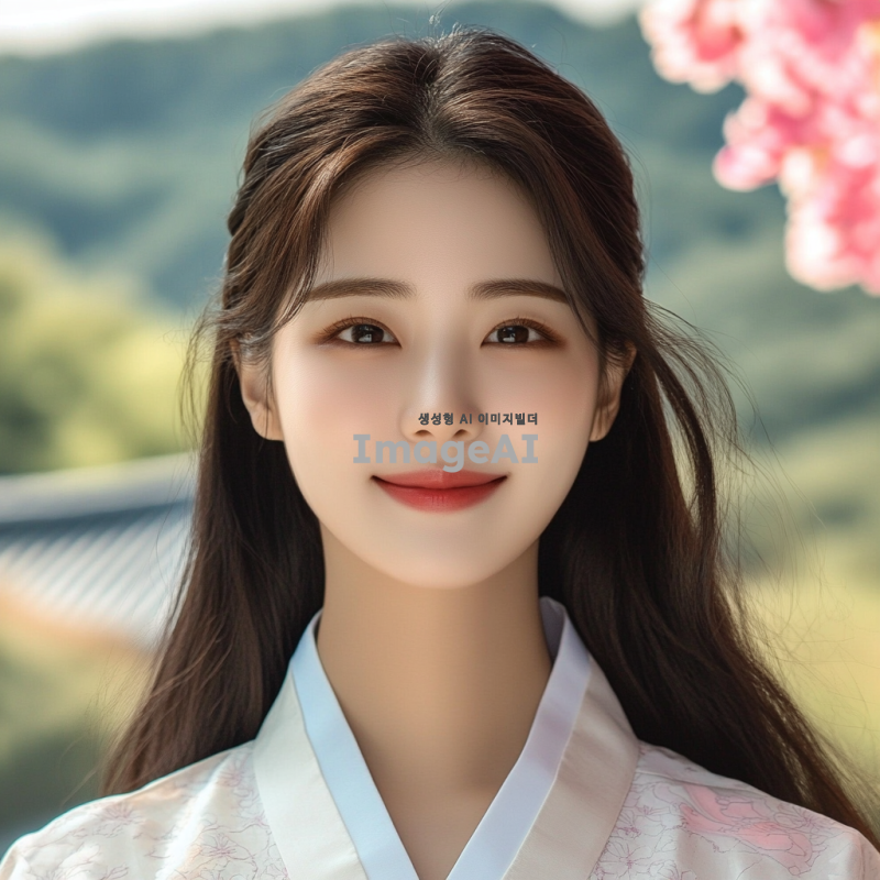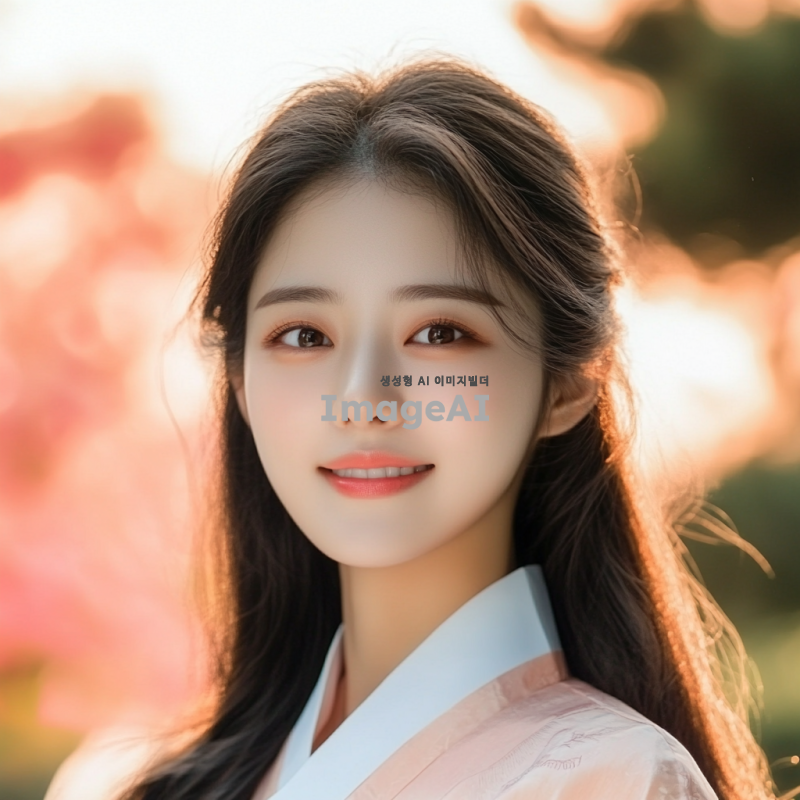 한국적인 여성 얼굴, 부드러운 피부, 긴 검은 머리, 전통 한복을 입고 있는 모습, 자연스러운 미소, 배경은 한국의 전통 정원, 따뜻한 햇살이 비치는 풍경, 세련된 아름다움, 우아한 포즈, 섬세한 메이크업, 전통적인 아름다움과 현대적인 감각이 조화된 모습