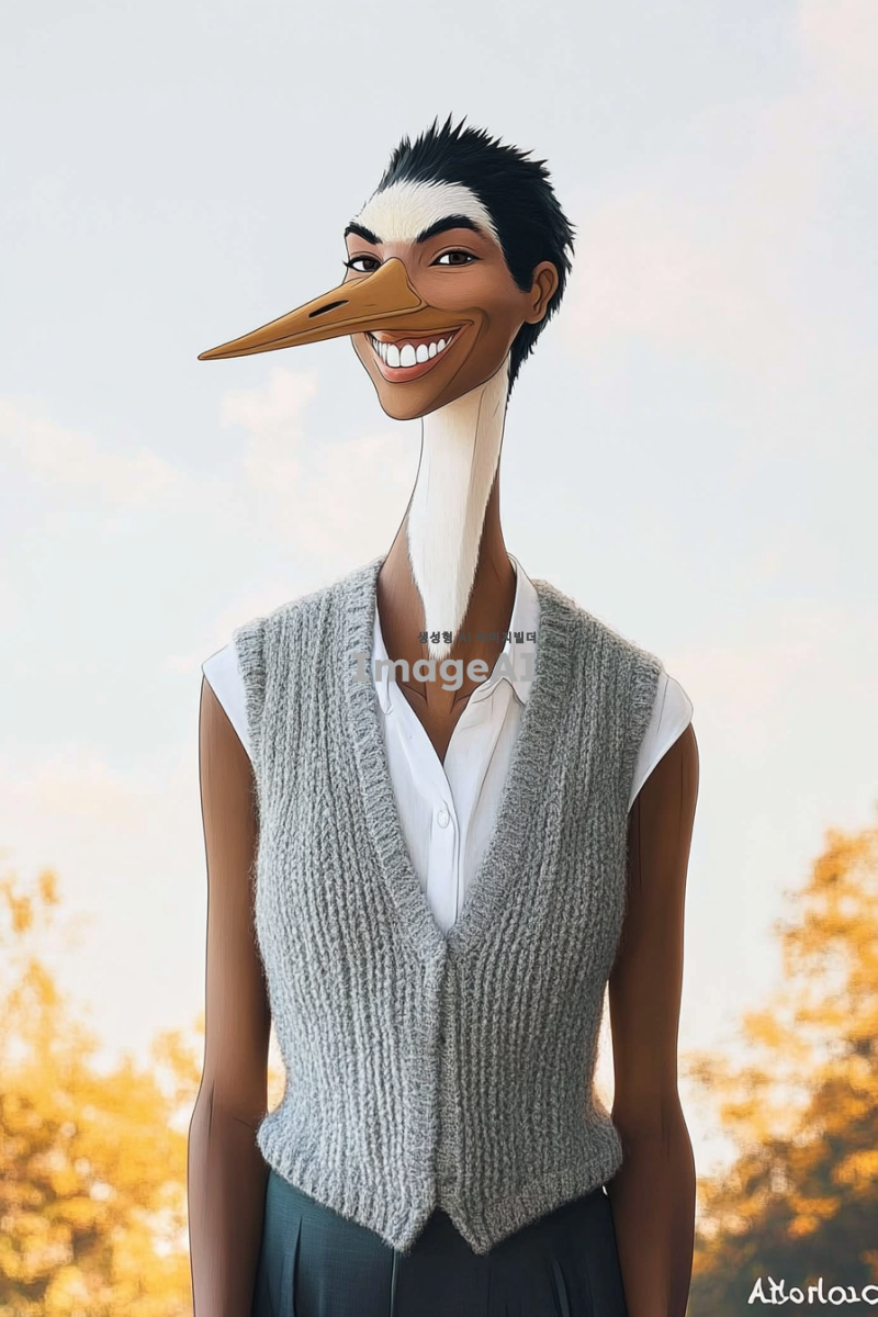 회색 민소매 니트를 입고 있는자연광 아래에서 웃고 있는 학