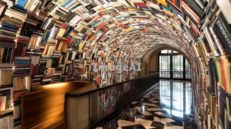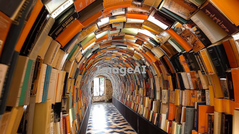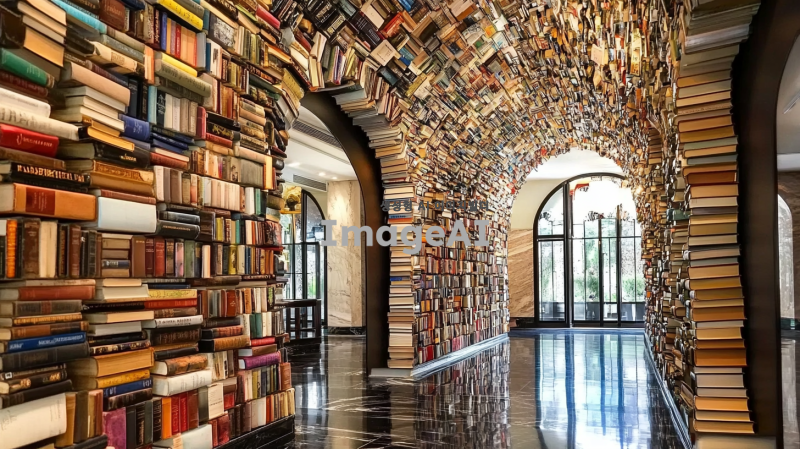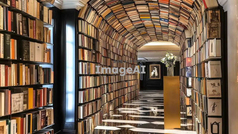 책으로 만들어진 터널이 해링턴 호텔 로비에 있으며, 수천 개의 다채로운 하드커버와 소프트커버 책 표지로 가득 차 있고, 높은 천장, 검은 대리석 바닥 타일, 검은 체크무늬 타일 작업, 건축 사진이 있습니다.