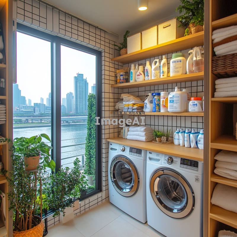 한강 뷰가 보이는 아파트 세탁실 내부, 세탁기와 건조기가 배치된 현대적인 디자인, 큰 창문을 통해 들어오는 자연광, 세탁 용품과 수건이 정리된 선반, 아늑하고 깔끔한 분위기, 세탁실의 벽면에는 밝은 색상의 타일과 식물이 장식되어 있는 모습