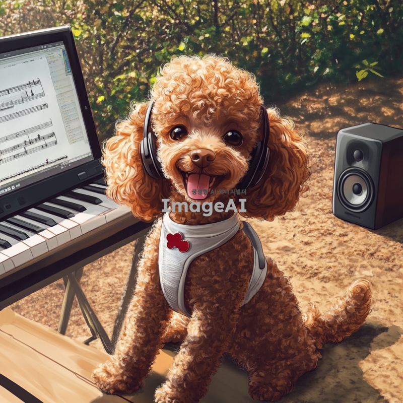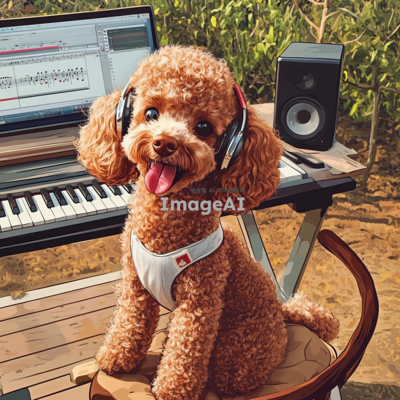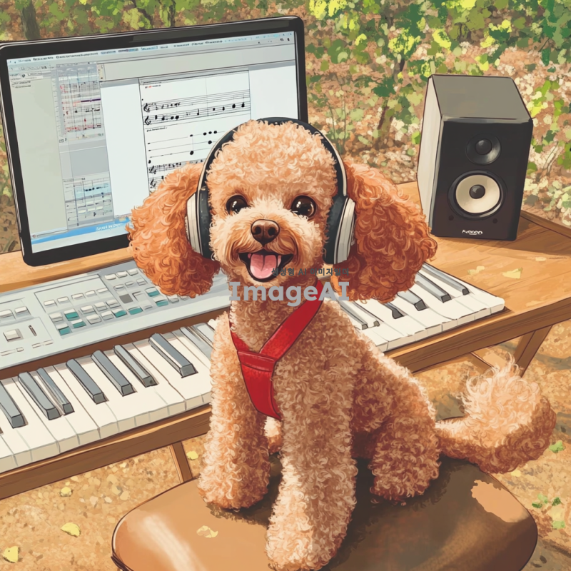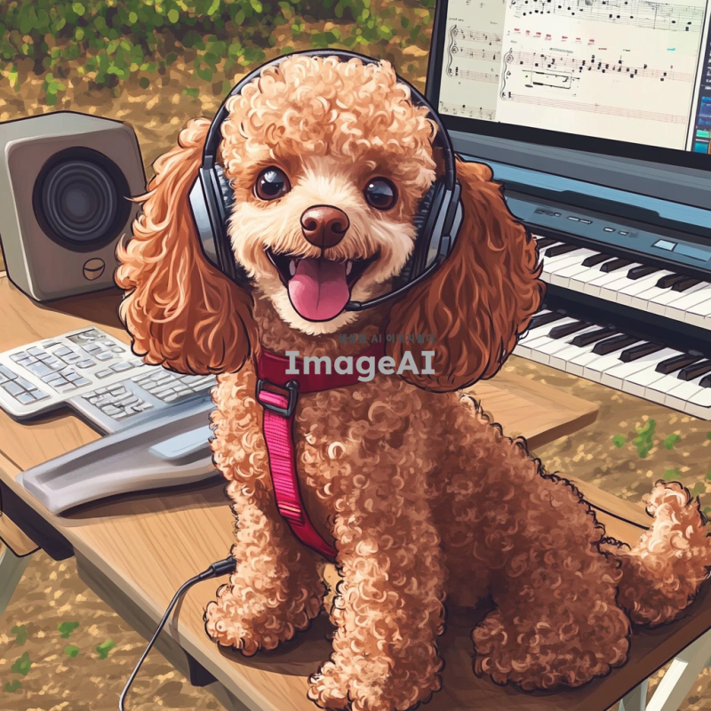 귀여운 갈색 푸들이 헤드폰을 끼고 의자에 앉아 있는 모습, 피아노 위에 푸들 손이 놓여 있고, 책상 위에는 컴퓨터와 스피커가 있으며, 작곡 프로그램이 켜져 있는 장면을 만화 스타일로 표현해 주세요. 밝고 경쾌한 색감으로, 푸들의 귀여운 표정과 주변 환경의 디테일을 강조해 주세요.