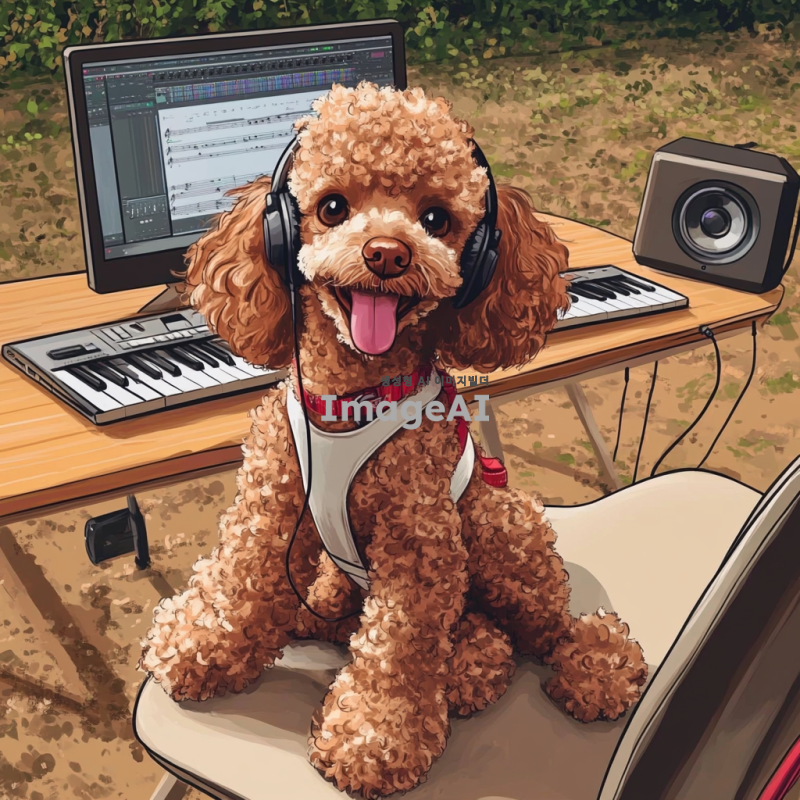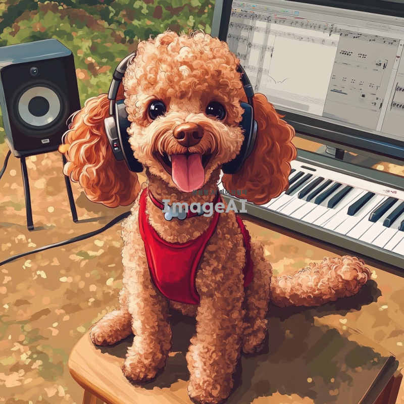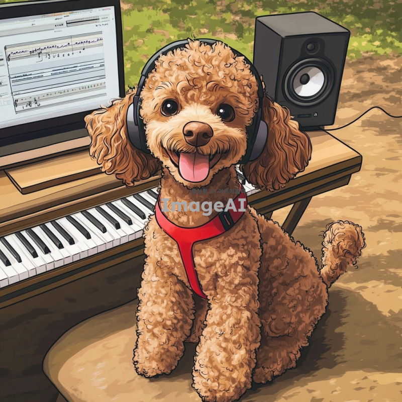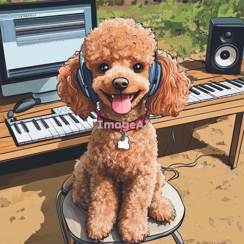 귀여운 갈색 푸들이 헤드폰을 끼고 의자에 앉아 있는 모습, 피아노 위에 푸들의 손이 놓여 있고, 책상 위에는 컴퓨터와 스피커가 있으며 작곡 프로그램이 켜져 있는 장면을 만화 스타일로 표현. 밝고 경쾌한 색감으로 푸들의 귀여운 표정을 강조하고, 배경은 음악 스튜디오로 설정.