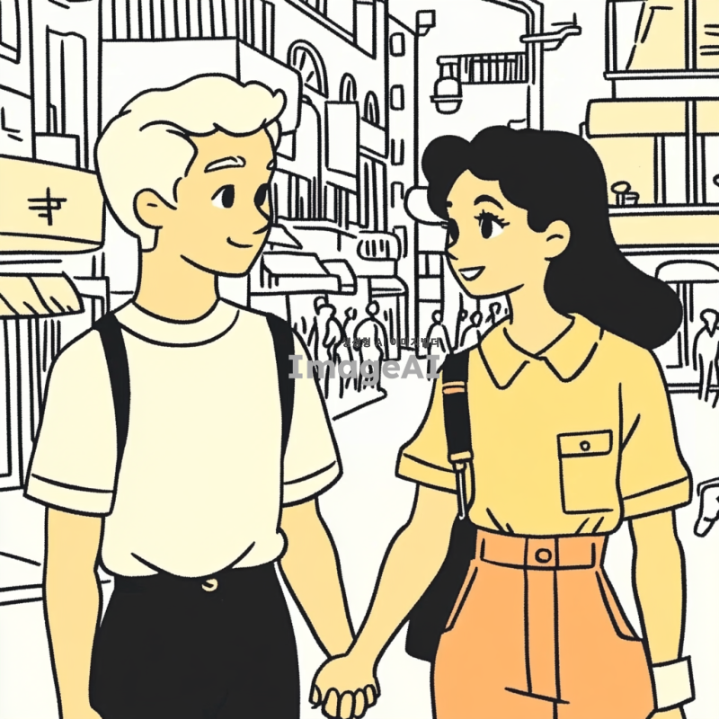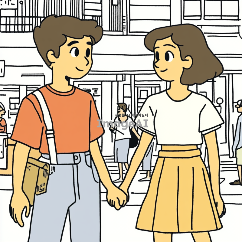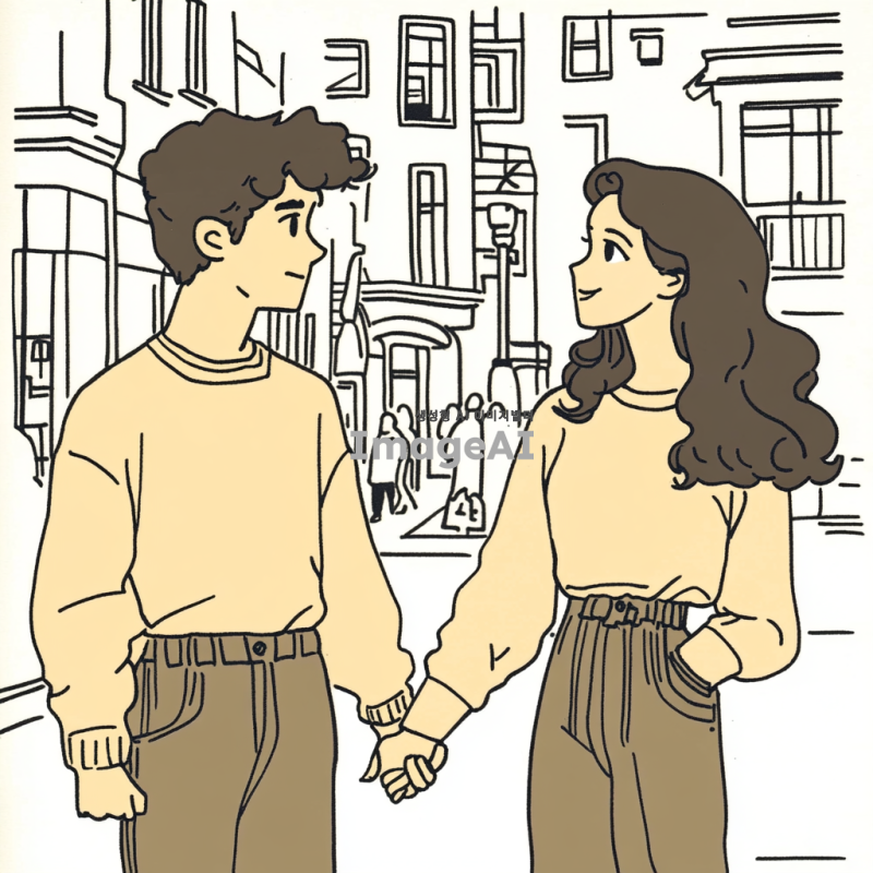 현대 도시 배경에서 서로 손을 잡고 있는 두 캐릭터의 모습. 캐릭터들은 한국인으로, 친근하고 따뜻한 표정을 지으며 서로를 바라보고 있다. 주변에는 현대적인 건물과 다양한 사람들로 가득한 거리 풍경이 보인다. 캐릭터들의 의상은 세련되고 캐주얼하며, 자연스러운 포즈로 서로의 손을 잡고 있는 모습이 강조되어 있다.