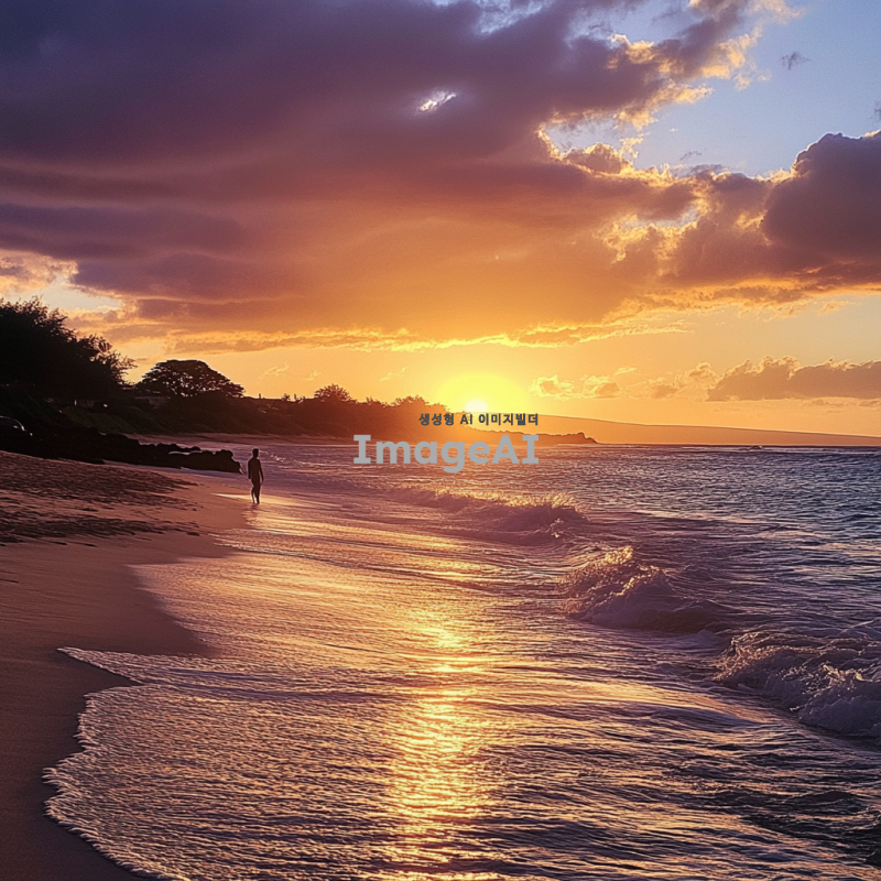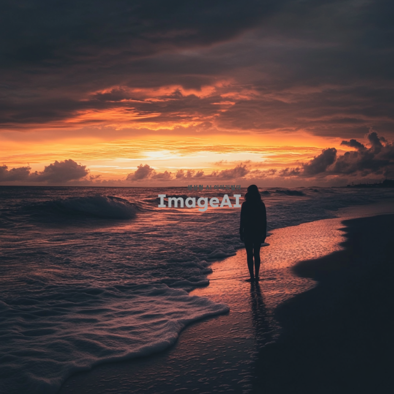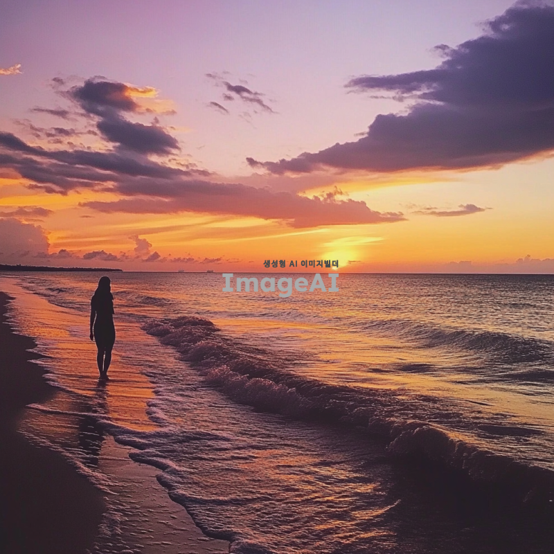노을이 지는 바닷가, 따뜻한 오렌지와 보라색 하늘, 잔잔한 파도가 밀려오는 풍경, 멀리서 보이는 사람의 실루엣, 고요하고 평화로운 분위기, 자연의 아름다움이 강조된 장면