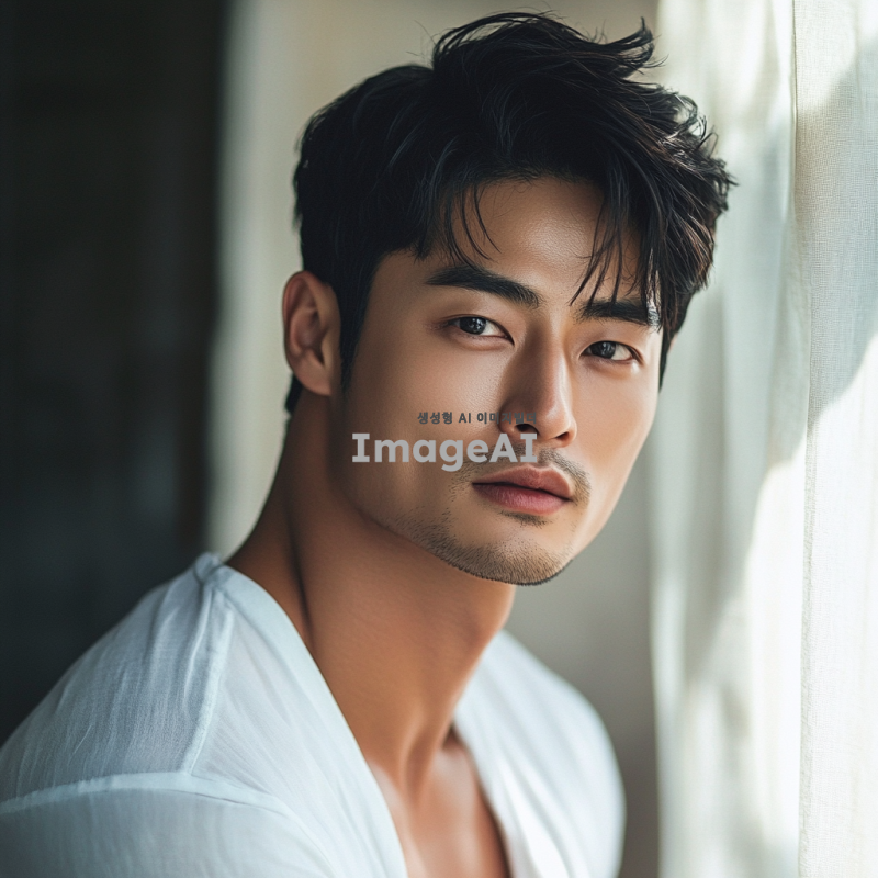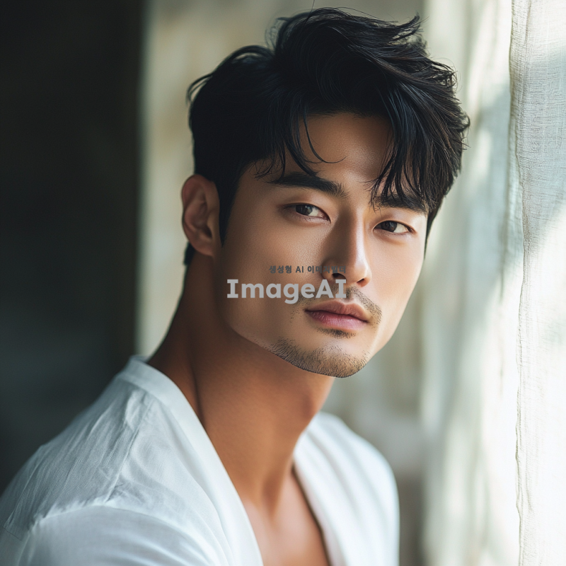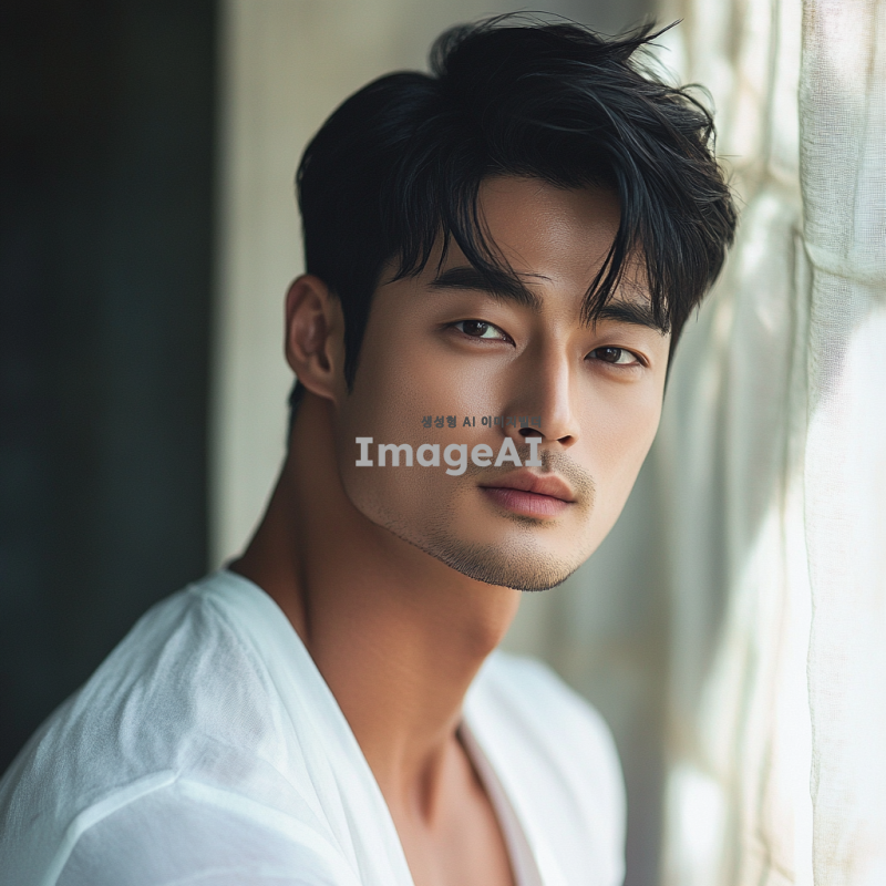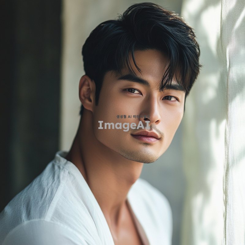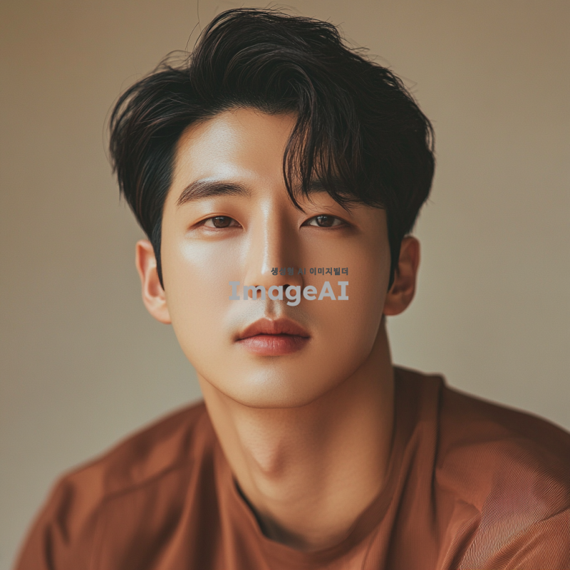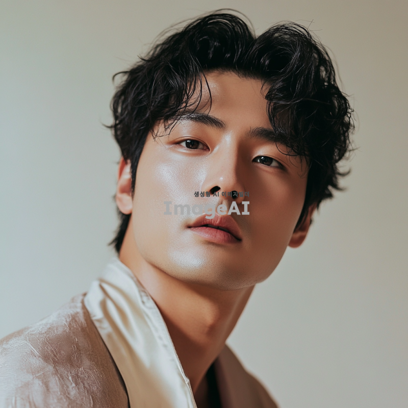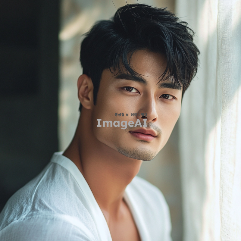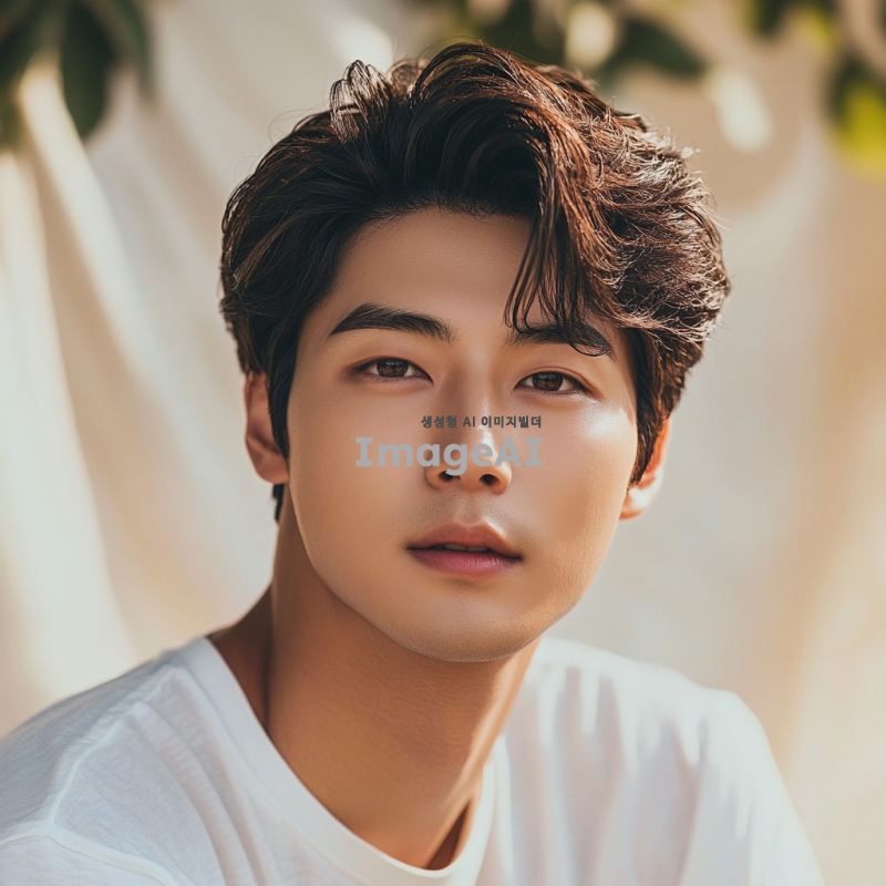 여름 쿨톤의 뮤트 색조가 잘 어울리는 부드러운 표정을 가진 한국 남성의 초상화. 자연광이 비치는 환경에서 편안한 포즈를 취하고 있으며, 부드러운 색감의 배경과 조화를 이루는 모습. 그의 스타일은 세련되면서도 자연스러운 느낌을 주며, 머리는 부드럽게 스타일링되어 있고, 피부는 건강하게 빛나고 있다.