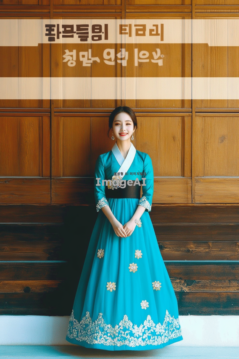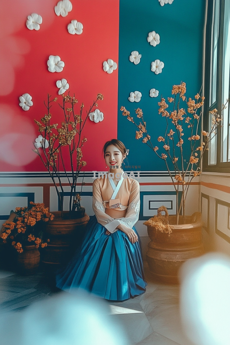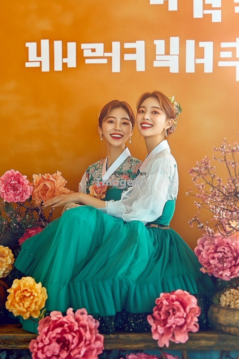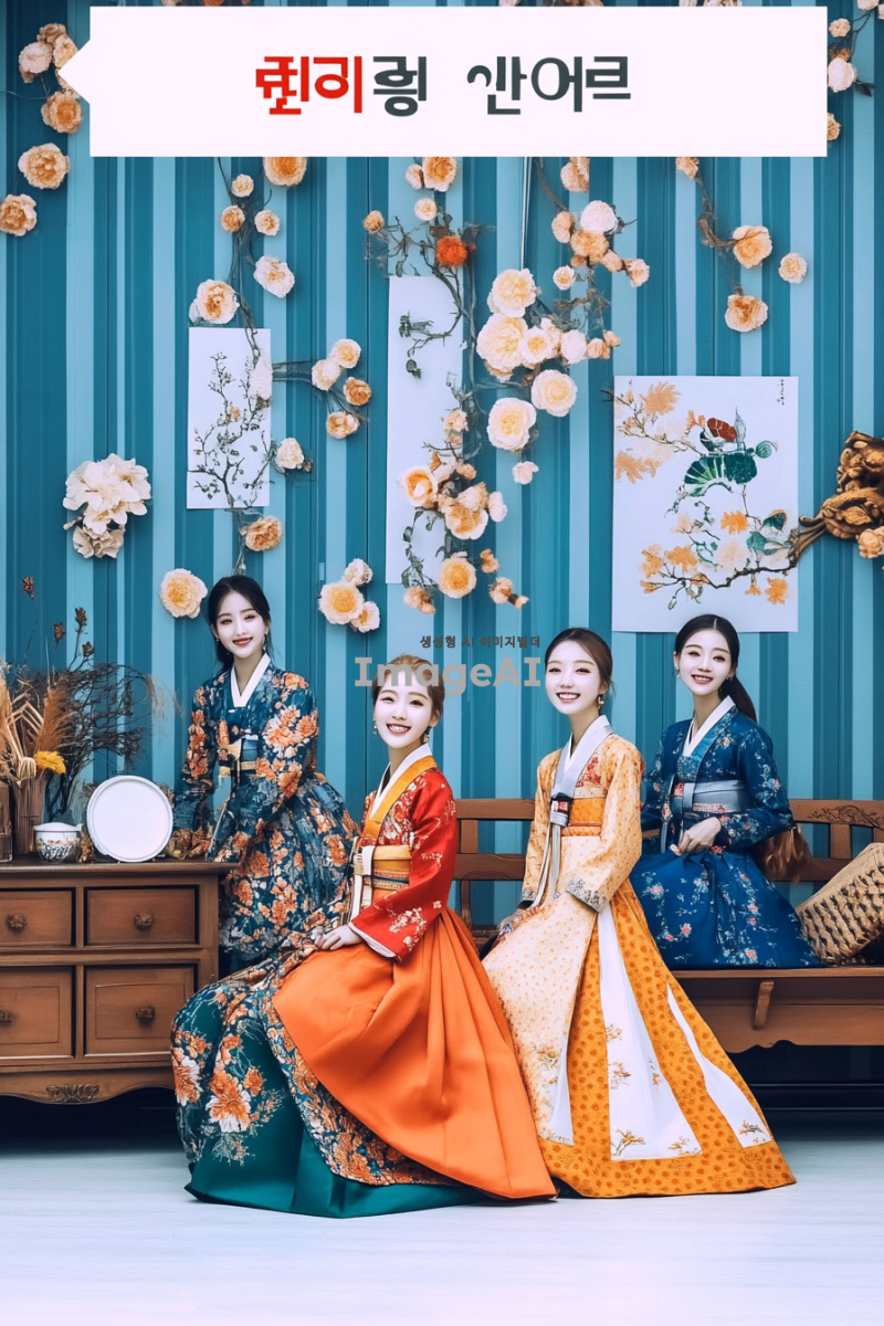 한국의 전통 설날을 기념하는 패션 기획전을 위해, 현대적인 감각이 가미된 한복을 입은 한국인 모델들이 다양한 배경에서 포즈를 취하고 있는 모습. 밝고 화려한 색상의 한복과 함께 전통 소품들이 조화롭게 배치되어 있으며, 설날의 풍성한 분위기를 강조하는 장식들이 있는 장면. 모델들은 각기 다른 스타일의 한복을 입고 있으며, 설날의 의미와 기쁨을 표현하는 미소를 짓고 있다.