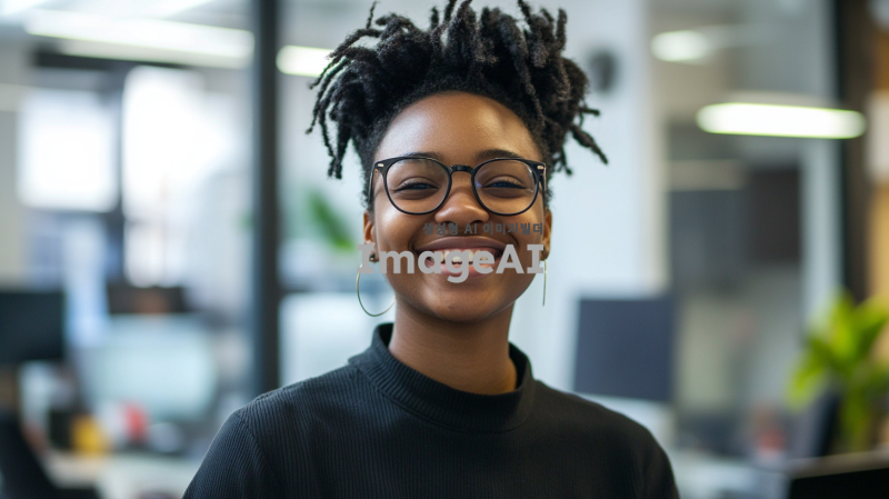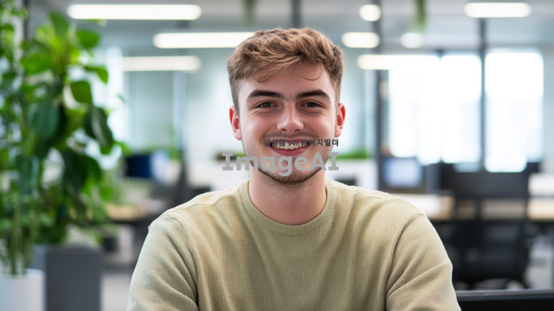젊은이 한 명이 회사의 로고가 있는 사무실에서 열정적으로 일하고 있는 모습, 밝은 표정과 함께 미래를 향한 희망적인 포부를 가지고 있는 장면, 현대적인 사무 환경과 다양한 기술 장비들이 배경에 있는 이미지.